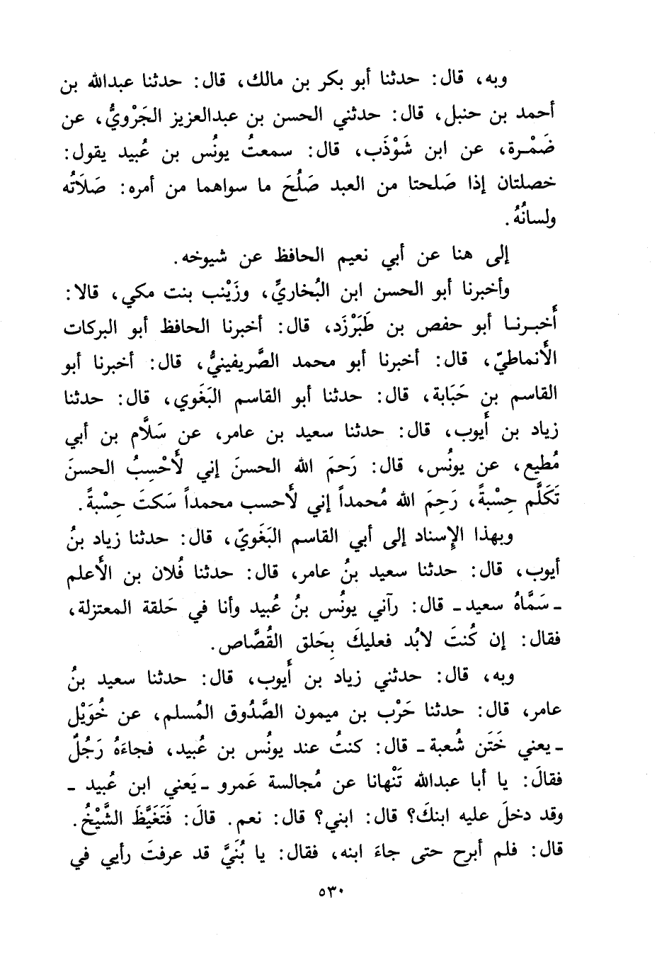 وبه، قال: حَدَّثَنَا أَبُو بَكْرِ بْن مالك، قال: حَدَّثَنَا عَبد اللَّهِ بْن أَحْمَد بْن حنبل، قال: حَدَّثَنِي الحسن بْن عبد العزيز الجروي، عَن ضمرة، عَن ابْن شوذب، قال: سمعت يونس بْن عُبَيد يقول: خصلتان إذا صلحتا من العبد صلح ما سواهما من أمره: صلاته ولسانه.