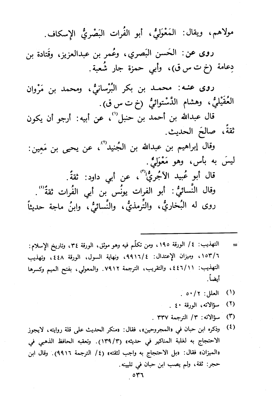 = التهذيب: 4 / الورقة 195، ومن تكلم فيه وهو موثق، الورقة 34، وتاريخ الاسلام: 6 / 153، وميزان الاعتدال: 4 / 9916، ونهاية السول، الورقة 448، وتهذيب التهذيب: 11 / 446، والتقريب، الترجمة 7912. والمعولي، بفتح الميم وكسرها أيضا.