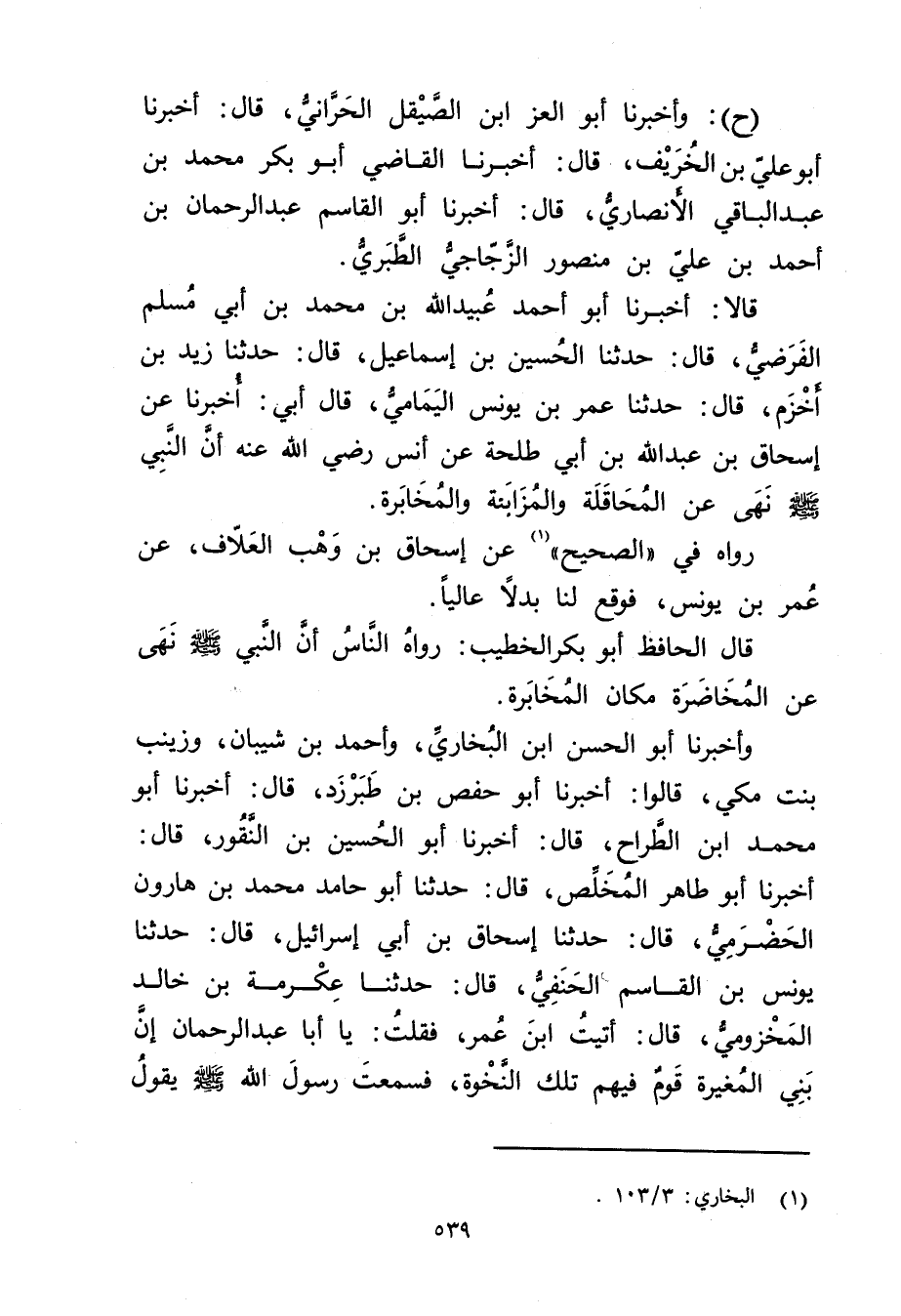 قَالا: أخبرنا أَبُو أَحْمَدَ عُبَيد الله بْن مُحَمَّد بْن أَبي مُسْلِمٍ الْفَرَضِيُّ، قال: حَدَّثَنَا الْحُسَيْنُ بْنُ إِسْمَاعِيلَ، قال: حَدَّثَنَا زَيْدُ بْنُ أَخْزَمَ، قال: حَدَّثَنَا عُمَر بْنُ يُونُسَ الْيَمَامِيُّ، قال أَبِي: أخبرنا عَنْ إِسْحَاقَ بْنِ عَبد اللَّهِ بْنِ أَبي طَلْحَةَ عن أنس رضي الله عَنْهُ أَنَّ النَّبِيَّ صلى الله عَلَيْهِ وسَلَّمَ نهى عَنِ المحاقلة والْمُزَابَنَةِ والْمُخَابَرَةِ.