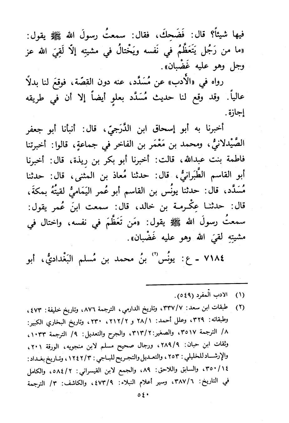أَخْبَرَنَا بِهِ أَبُو إِسْحَاقَ ابْنُ الدَّرَجِيِّ، قال: أنبأنا أَبُو جَعْفَرٍ الصَّيْدَلانِيُّ، ومُحَمَّدُ بْنُ مَعْمَرِ بْنِ الْفَاخِرِ فِي جَمَاعَةٍ، قَالُوا: أَخْبَرَتْنا فَاطِمَةُ بِنْتُ عَبد اللَّهِ، قَالَتْ: أخبرنا أَبُو بَكْرِ بْنُ رِيذَةَ، قال: أخبرنا أَبُو الْقَاسِمِ الطَّبَرَانِيُّ، قال: حَدَّثَنَا مُعَاذُ بْنُ الْمُثَنَّى، قال: حَدَّثَنَا مُسَدَّدٌ، قال: حَدَّثَنَا يُونُسُ بْنُ الْقَاسِمِ أَبُو عُمَر الْيَمَامِيُّ لَقِيتُهُ بِمَكَّةَ، قال: حَدَّثَنَا عِكْرِمَةُ بْنُ خَالِدٍ، قال: سَمِعْتُ ابْنَ عُمَر يَقُولُ: سَمِعْتُ رَسُولَ اللَّهِ صَلَّى اللَّهُ عَلَيْهِ وسَلَّمَ يقول: مَنْ تَعَظَّمَ فِي نَفْسِهِ، واخْتَالَ فِي مِشْيَتِهِ لَقِيَ اللَّهَ وهُوَ عَلَيْهِ غَضْبَانُ.