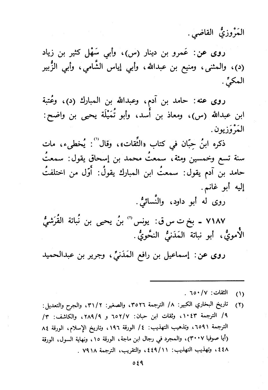 (2) تاريخ البخاري الكبير: 8 / الترجمة 3526، والصغير: 2 / 31، والجرح والتعديل: 9 / الترجمة 1043، وثقات ابن حبان: 7 / 652 و9 / 289، والكاشف: 3 / الترجمة 6591، وتذهيب التهذيب: 4 / الورقة 196، وتاريخ الاسلام، الورقة 84 (أيا صوفيا 3007) ، والمجرد في رجال ابن ماجة، الورقة 15، ونهاية السول، الورقة 448، وتهذيب التهذيب: 11 / 449، والتقريب، الترجمة 7918.