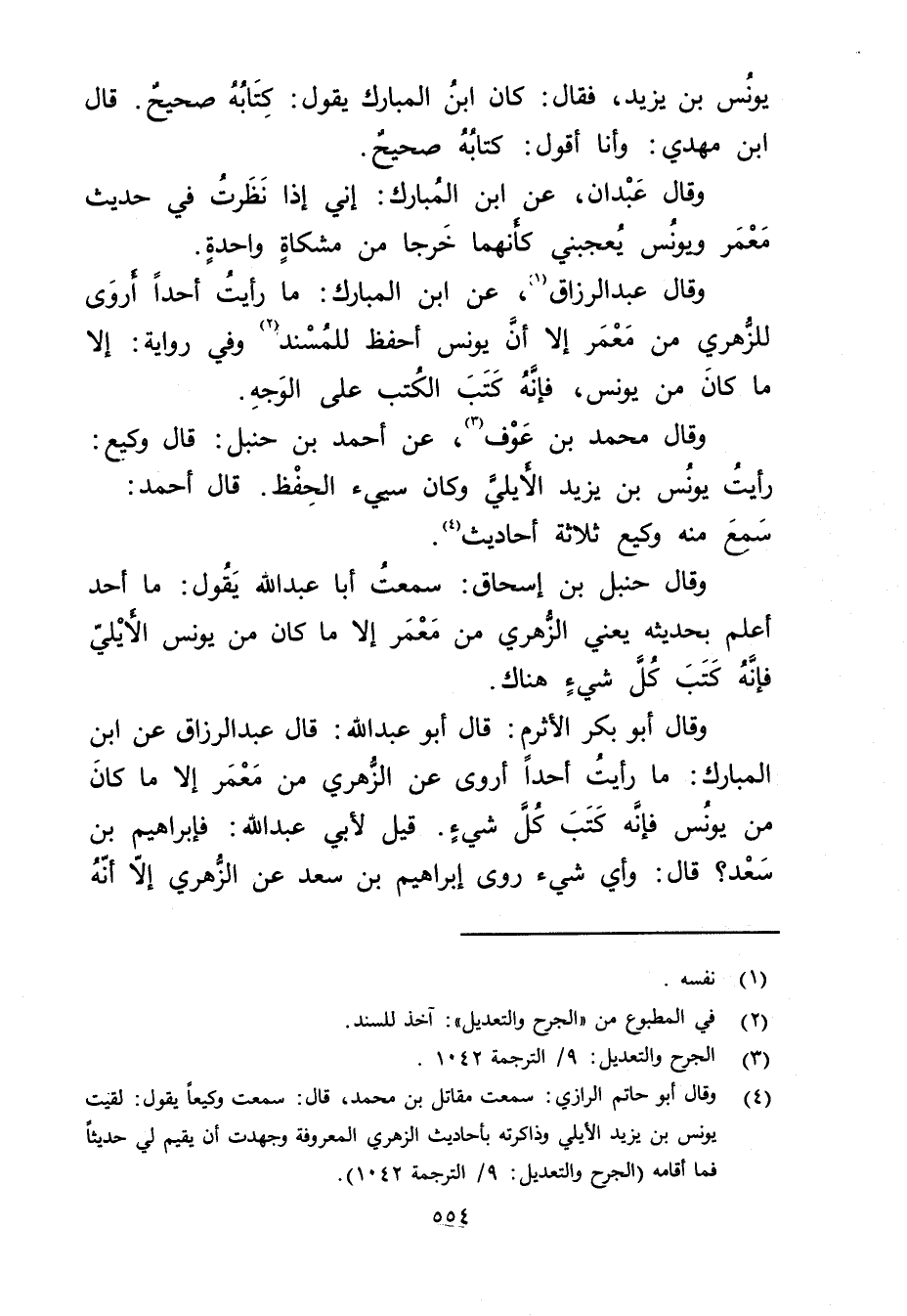 (4) وَقَال أَبُو حاتم الرازي: سمعت مقاتل بن محمد، قال: سمعت وكيعا يقول: لقيت يونس بن يزيد الايلي وذاكرته بأحاديث الزُّهْرِيّ المعروفة وجهدت أن يقيم لي حديثًا فما أقامه (الجرح والتعديل: 9 / الترجمة 1042) .