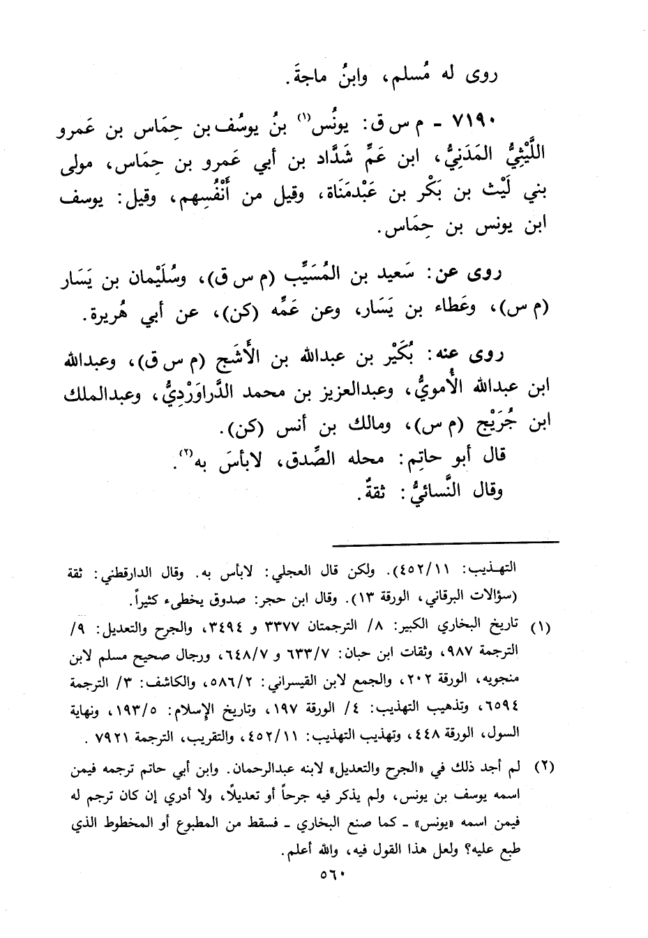 7190 - م س ق: يونس بن يوسف بن حماس بن عَمْرو الليثي المدني (1) ، ابْن عم شداد بن أَبي عَمْرو بن حماس، مولى بني ليث بْن بَكْر بن عبدمناة، وقيل من أنفسهم، وقيل: يوسف ابن يونس بْن حماس.