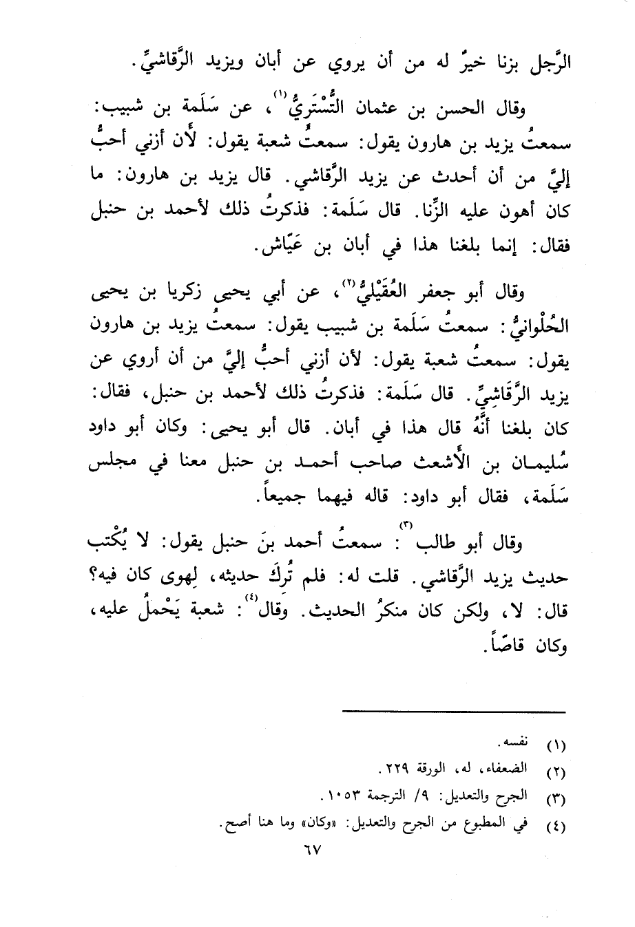 وَقَال أَبُو جعفر العقيلي (2) ، عَن أَبِي يحيى زكريا بْن يحيى الحلواني: سمعت سلمة بن شبيب يقول: سمعت يزيد بن هارون يَقُولُ: سمعت شعبة يقول: لأن أزني أحب إلي من أن أروي عَن يزيد الرقاشي. قال سلمة: فذكرت ذلك لأحمد بن حنبل، فقال: كَانَ بلغنا أنه قال هذا في أبان. قال أبويحيى: وكان أَبُو داود سُلَيْمان بْن الأشعث صاحب أحمد بْن حنبل معنا فِي مجلس سلمة، فقال أَبُو داود: قاله فيهما جميعا.