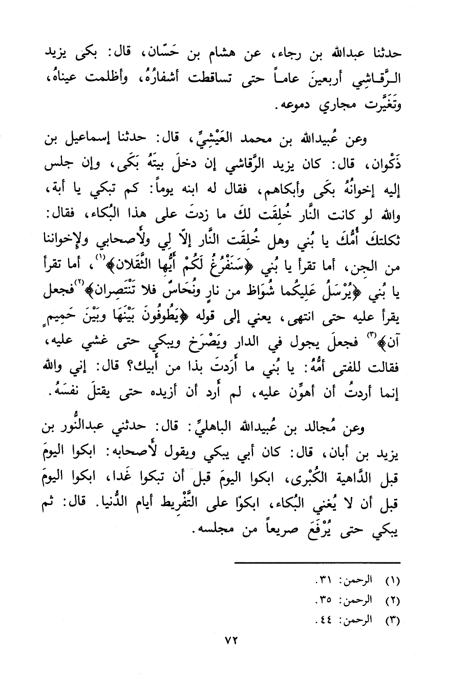 عَنْ عُبَيد اللَّهِ بْن مُحَمَّد العيشي، قال: حَدَّثَنَا إسماعيل بْن ذكوان، قال: كَانَ يزيد الرقاشي إن دخل بيته بكى، وإن جلس إليه إخوانه بكى وأبكاهم، فقال لَهُ ابنه يوما: كم تبكي يَا أبة، والله لو كَانَت النار خلقت لك ما زدت على هذا البكاء، فقال: ثكلتك أمك يَا بني وهل خلقت النار إلا لي ولأصحابي ولأَخُواننا من الجن، أما تقرأ يا بني (سنفرغ لكم أيها الثقلان) (1) ، أما تقرأ يَا بني (يرسل عليكما شواظ من نار ونحاس فلا تنتصران) (2) فجعل يقرأ عَلَيْهِ حتى انتهى، يعني إلى قوله (يطوفون بينها وبين حميم آن) (3) فجعل يجول فِي الدار ويصرخ ويبكي حتى غشي عَلَيْهِ، فقالت للفتى أمه: يَا بني ما أردت بذا من أبيك؟ قال: إني والله إنما أردت أن أهون عَلَيْهِ، لم أرد أن أزيده حتى يقتل نفسه.