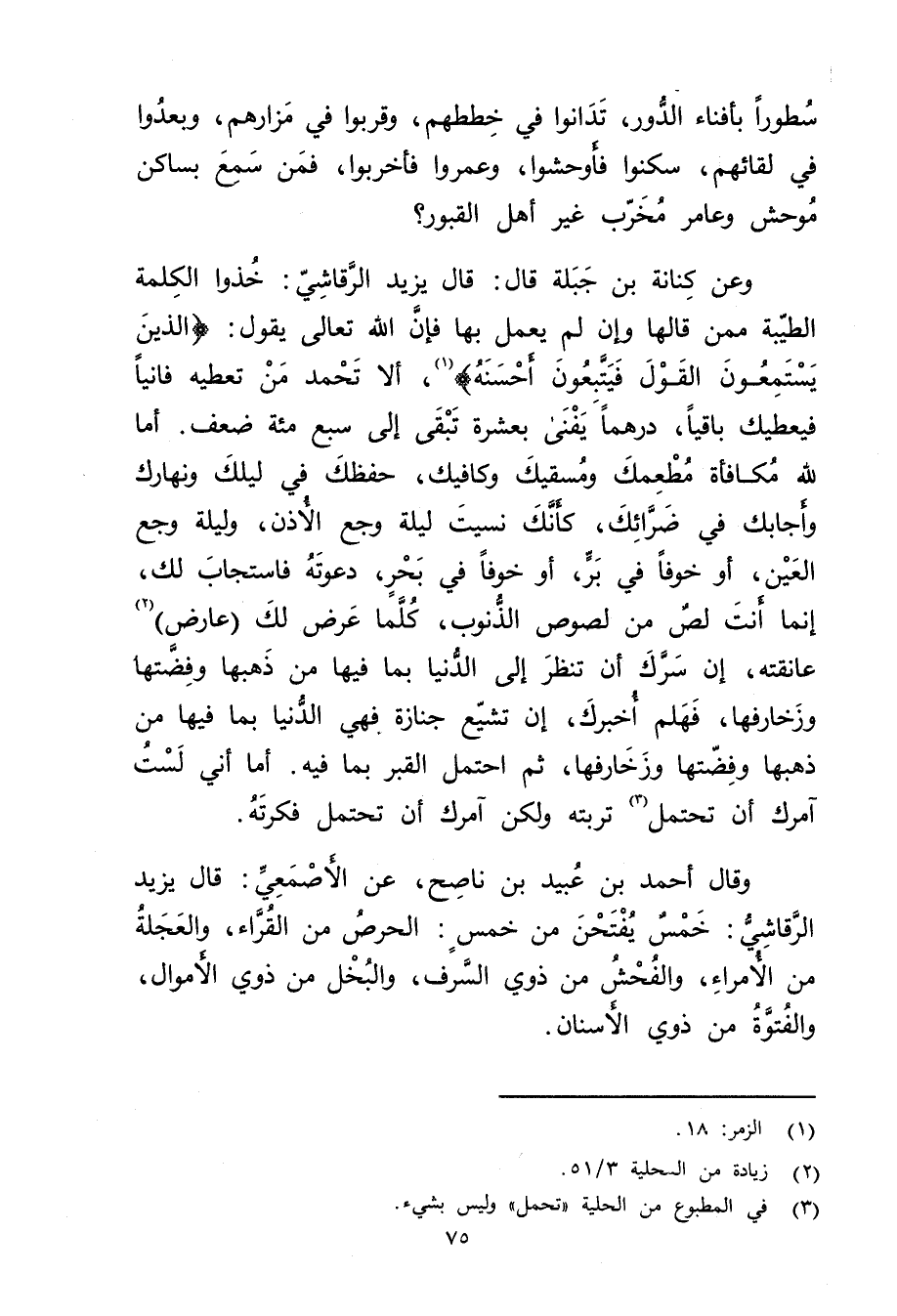 وعن كنانة بْن جبلة قال: قال يزيد الرقاشي: خذوا الكلمة الطيبة ممن قالها وإن لم يعمل بها فإن اللَّهِ تعالى يقول: (الذين يستمعون القول فيتبعون أحسنه" (1) ، ألا تحمد من تعطيه فانيا فيعطيك باقيا، درهما يفنى بعشرة تبقى إلى سبع مئة ضعف. أما لله مكافأة مطعمك ومسقيك وكافيك، حفظك فِي ليلك ونهارك وأجابك فِي ضرائك، كأنك نسيت ليلة وجع الأذن، وليلة وجع العين، أو خوفا فِي بر، أو خوفا فِي بحر، دعوته فاستجاب لك، إنما أنت لص من لصوص الذنوب، كلما عرض لك (عارض) (2) عانقته، إن سرك أن تنظر إلى الدنيا بما فيها من ذهبها وفضتها وزخارفها، فهلم أخبرك، إن تشيع جنازة فهي الدنيا بما فيها من ذهبها وفضتها وزخارفها، ثم احتمل القبر بما فيه. أما أنت لست آمرك أن تحتمل (3) تربته ولكن آمرك أن تحتمل فكرته.