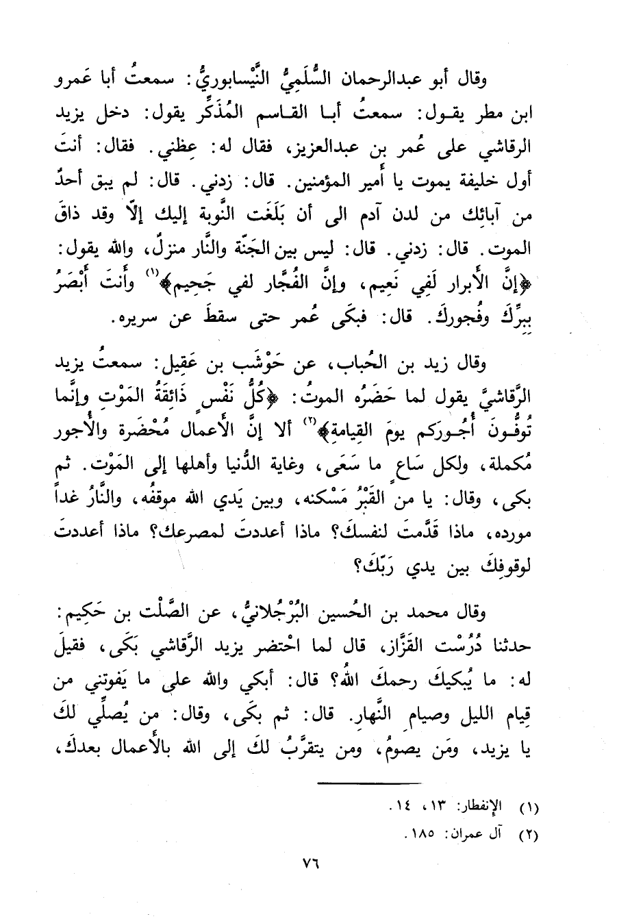 وَقَال أَبُو عَبْد الرَّحْمَنِ السلمي النيسابوري: سمعت أبا عَمْرو ابن مطر يقول: سمعت أَبَا القاسم المذكر يقول: دخل يزيد الرقاشي على عُمَر بْن عَبْد العزيز، فقال لَهُ: عظني. فقال: أنت أول خليفة يموت يَا أمير المؤمنين. قال: زدني. قال: لم يبق أحد من آبائك من لدن آدم إلى أن بلغت النوبة إليك إلا وقد ذاق الموت. قال: زدني. قال: ليس بين الجنة والنار منزل، والله يقول: (إن الأبرار لفي نعيم، وإن الفجار لفي جحيم) (1) وأنت أبصر ببرك وفجورك.