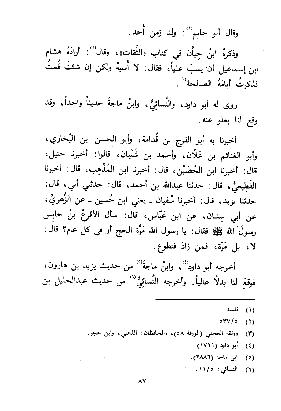 أَخْبَرَنَا بِهِ أَبُو الْفَرَجِ بْنُ قُدَامَةَ، وأَبُو الْحَسَنُ بْنُ الْبُخَارِيِّ، وأَبُو الْغَنَائِمِ بْن علان، وأحمد بْن شيبان، قَالُوا: أخبرنا حنبل، قال: أخبرنا ابن الحصين، قال: ءخبرنا ابْنُ الْمُذْهِب، قال: أخبرنا القَطِيعِيّ، قال: حَدَّثَنَا عَبد اللَّهِ بْن أَحْمَدَ، قال: حَدَّثني أبي، قال: حَدَّثَنَا يَزِيدُ، قال: أخبرنا سُفْيَانُ، يَعْنِي ابْنَ حُسَيْنٍ، عَن الزُّهْرِيّ، عَن أَبِي سِنَانٍ، عَنِ ابْنِ عَبَّاسٍ، قال: سَأَلَ الأَقْرَعُ بْنُ حَابِسٍ رَسُولَ اللَّهِ صلى الله عَلَيْهِ وسَلَّمَ فقَالَ: يا رَسُول اللَّهِ مَرَّة الحج أو فِي كل عام؟ قال: لا، بل مرة، فمن زاد فتطوع.