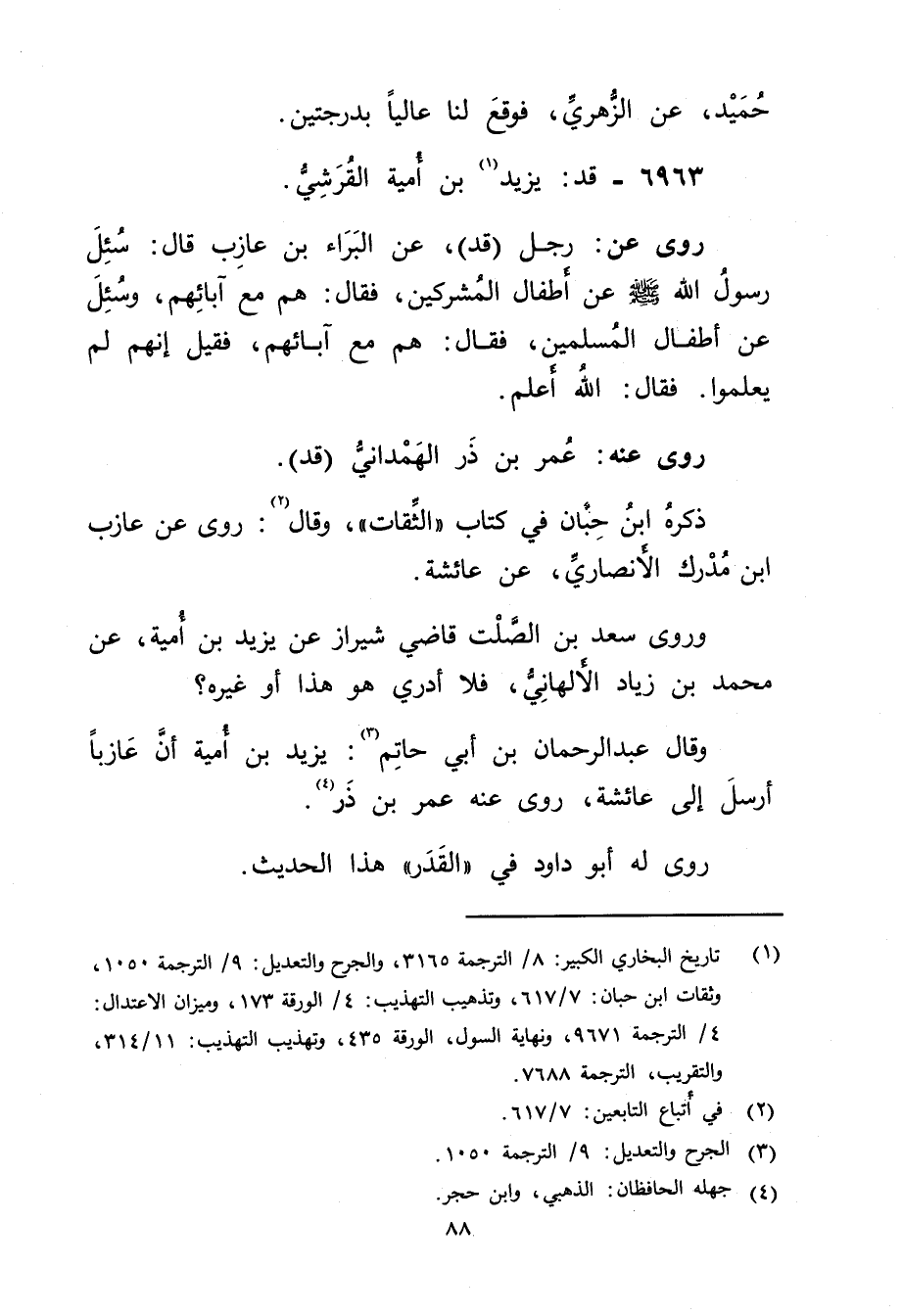 (1) تاريخ البخاري الكبير: 8 / الترجمة 3165، والجرح والتعديل: 9 / الترجمة 1050، وثقات ابن حبان: 7 / 617، وتذهيب التهذيب: 4 / الورقة 173، وميزان الاعتدال: 4 / الترجمة 9671، ونهاية السول، الورقة 435، وتهذيب التهذيب: 11 / 314،