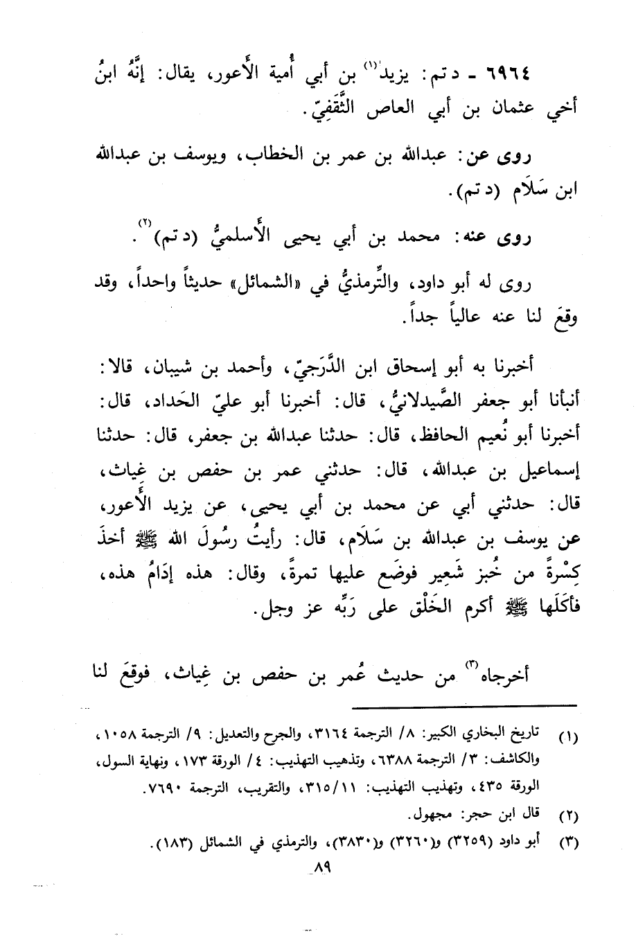 أَخْبَرَنَا بِهِ أَبُو إِسْحَاقَ ابْنُ الدَّرَجِيِّ، وأَحْمَدُ بْنُ شَيْبَانَ، قالا: أَنْبَأَنَا أَبُو جَعْفَرٍ الصَّيْدَلانِيُّ، قال: أَخْبَرَنَا أَبُو عَلِيّ الحداد، قال: أَخْبَرَنَا أبو نعيم الحافظ، قال: حَدَّثَنَا عببد اللَّهِ بْنُ جَعْفَرٍ، قال: حَدَّثَنَا إِسْمَاعِيلُ بْنُ عَبد اللَّهِ، قال: حَدَّثَنِي عُمَر بْنُ حَفْصِ بْنِ غِيَاثٍ، قال: حَدَّثني أَبِي عَن مُحَمَّد بْن أَبي يحيى، عن يزيد الأَعور، عَنْ يوسف بْن عَبد اللَّهِ بن سلام، قال: رأيت رَسُول اللَّهِ صلى الله عليه وسلم أَخَذَ كِسْرَةً مِنْ خُبْزِ شُعَيْرٍ فَوَضَعَ عَلَيْهَا تَمْرَةً، وَقَال: هَذِهِ إِدَامُ هَذِهِ، فَأَكَلَهَا صلى الله عليه وسلم أَكْرَمُ الخلق على ربه عزوجل.