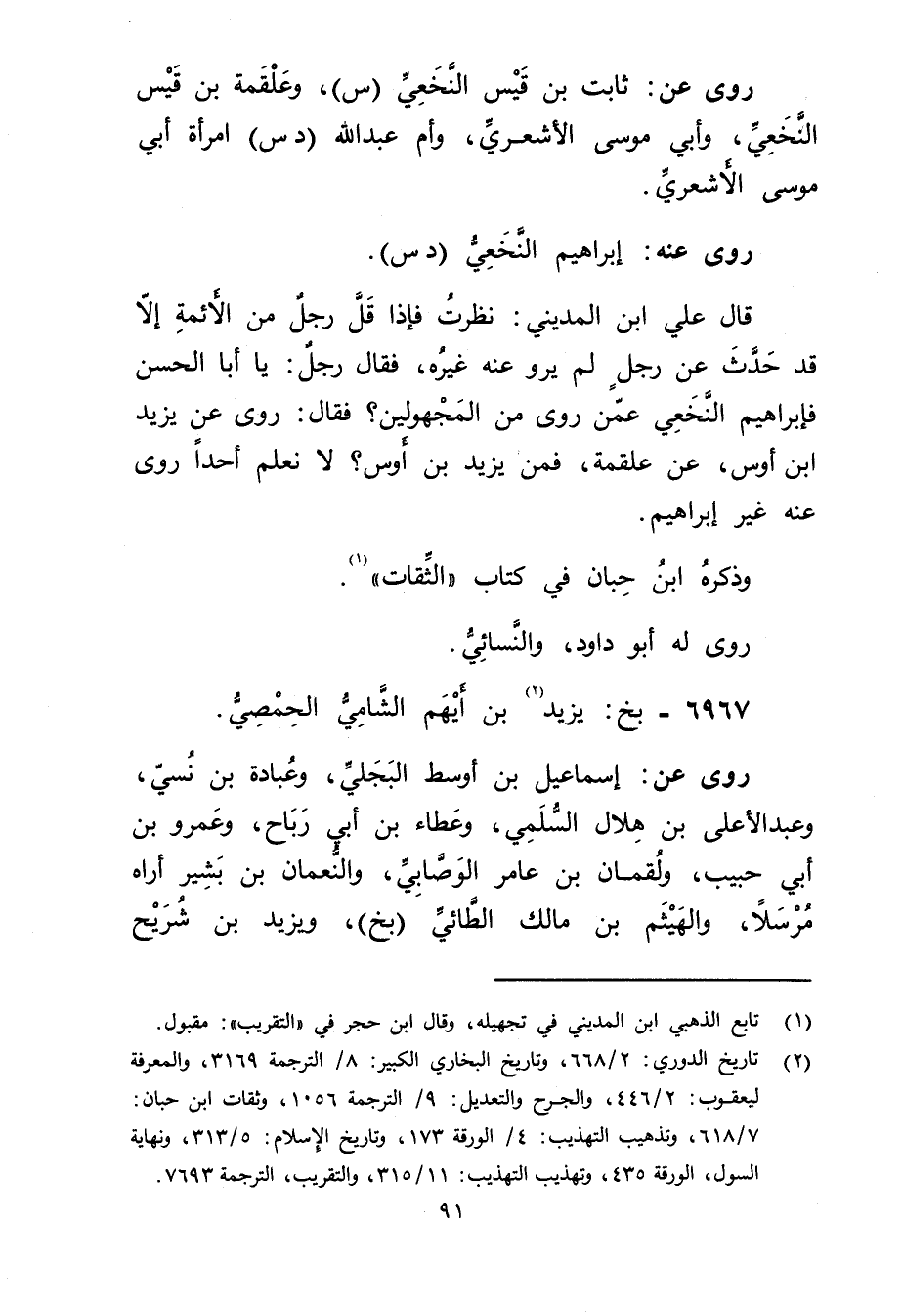 (2) تاريخ الدوري: 2 / 668، وتاريخ البخاري الكبير: 8 / الترجمة 3169، والمعرفة ليعقوب: 2 / 446، والجرح والتعديل: 9 / الترجمة 1056، وثقات ابن حبان: 7 / 618، وتذهيب التهذيب: 4 / الورقة 173، وتاريخ الاسلام: 5 / 313، ونهاية السول، الورقة 435، وتهذيب التهذيب: 11 / 315، والتقريب، الترجمة 7693.