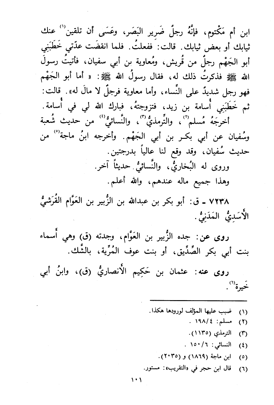 أَخْرَجَهُ مُسْلِمٌ (2) ، والتِّرْمِذِيّ (3) ، والنَّسَائي (4) مِنْ حَدِيثِ شُعْبَةَ وسُفْيَانَ عَن أَبِي بَكْرِ بْنِ أَبي الْجَهْمِ. وأَخْرَجَهُ ابْنُ مَاجَهْ (5) مِنْ حَدِيثِ سُفْيَانَ، وقَدْ وقَعَ لَنَا عَالِيًا بِدَرَجَتَيْنِ.