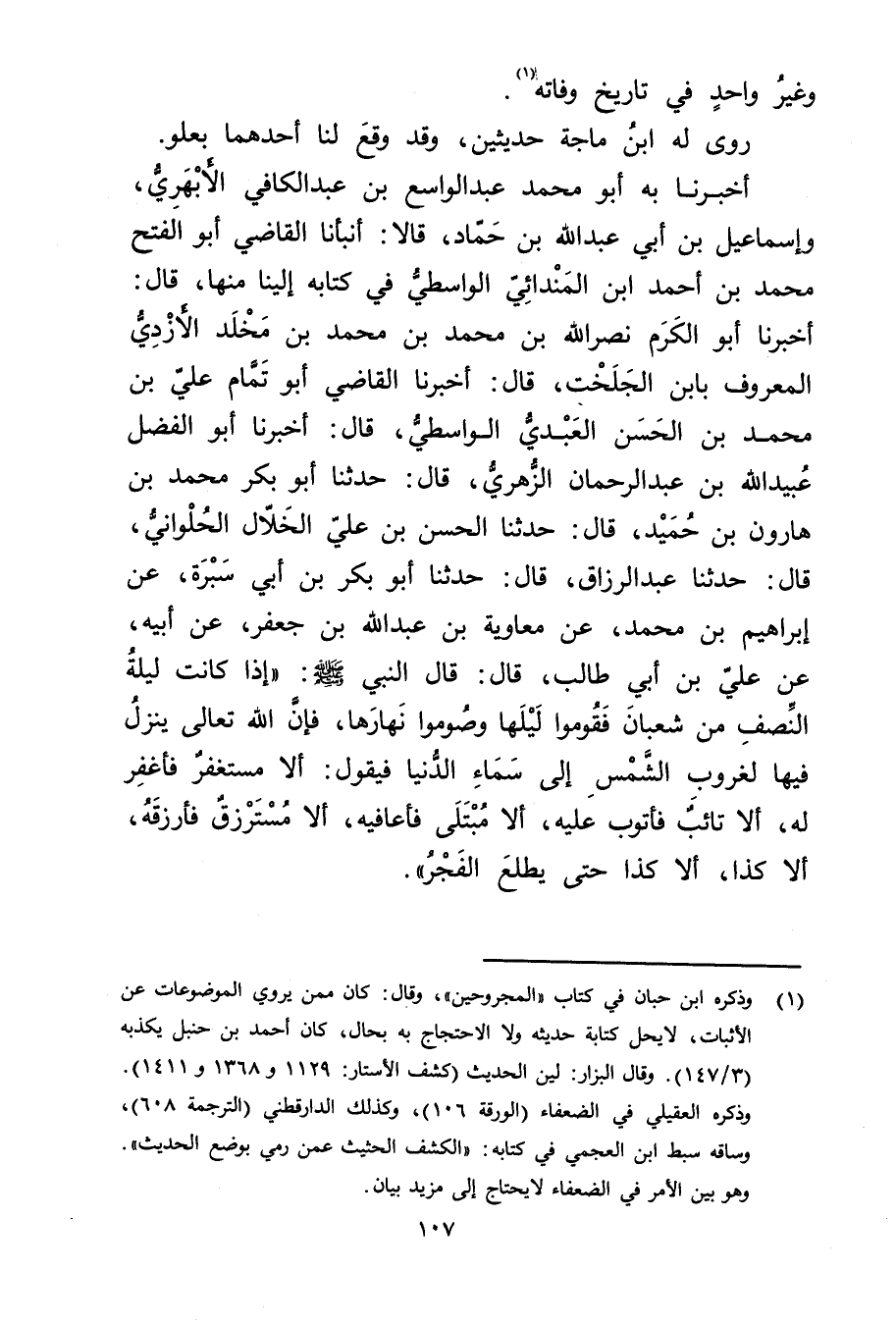 أَخْبَرَنَا بِهِ أَبُو مُحَمَّدٍ عَبْدُ الواسع بْن عَبْدِ الكافي الأبهري، وإسماعيل بْن أَبي عَبد الله بْنِ حَمَّادٍ، قَالا: أَنْبَأَنَا الْقَاضِي أَبُو الفتح مُحَمَّد بْن أَحْمَدَ بْنِ المندائي، الواسطي في كتابه إلينا منها، قال: أَخْبَرَنَا أَبُو الْكَرَمِ نَصْرُ اللَّهِ بْنُ مُحَمَّدِ بْنِ مُحَمَّدِ بْنِ مَخْلَدٍ الأَزْدِيُّ الْمَعْرُوفُ بِابْنِ الْجَلَخْتِ، قال: أَخْبَرَنَا الْقَاضِي أَبُو تَمَّامٍ عَلِيُّ بْنُ مُحَمَّدِ بْنِ الْحَسَنِ الْعَبْدِيُّ الْوَاسِطِيُّ، قال: أَخْبَرَنَا أَبُو الفضل عُبَيد اللَّه بْن عَبْد الرحمن الزُّهْرِيّ، قال: حَدَّثَنَا أَبُو بَكْر مُحَمَّد بْنُ هَارُونَ بْنِ حُمَيْدٍ، قال: حَدَّثَنَا الْحَسَنُ بْنُ عَلِيٍّ الْخَلالُ الْحُلْوَانِيُّ، قال: حَدَّثَنَا عَبْدُ الرَّزَّاقِ، قال: حَدَّثَنَا أبو بكر بْن أَبي سَبْرَةَ، عَنْ إِبْرَاهِيمَ بْنِ مُحَمَّدٍ، عَنْ مُعَاوِيَةَ بْنِ عَبد اللَّهِ بْنِ جَعْفَرٍ، عَن أَبِيهِ، عن علي بْن أَبي طالب، قال: قال النبي صَلَّى اللَّهُ عَلَيْهِ وسَلَّمَ: إِذَا كَانَتْ لَيْلَةُ النِّصْفِ مِنْ شَعْبَانَ فَقُومُوا لَيْلَهَا وصُومُوا نَهَارَهَا، فَإِنَّ اللَّهَ تَعَالَى يَنْزِلُ فِيهَا لِغُرُوبِ الشَّمْسِ إِلَى سَمَاءِ الدُّنْيَا فَيَقُولُ: أَلا مُسْتَغْفِرٌ فَأَغْفِرُ لَهُ، أَلا تَائِبٌ فَأَتُوبُ عَلَيْهِ، أَلا مُبْتَلًى فَأُعَافِيَهُ، أَلا مُسْتَرْزِقٍ فَأَرْزُقُهُ، أَلا كَذَا، أَلا كذا حتى يطلع الفجر.