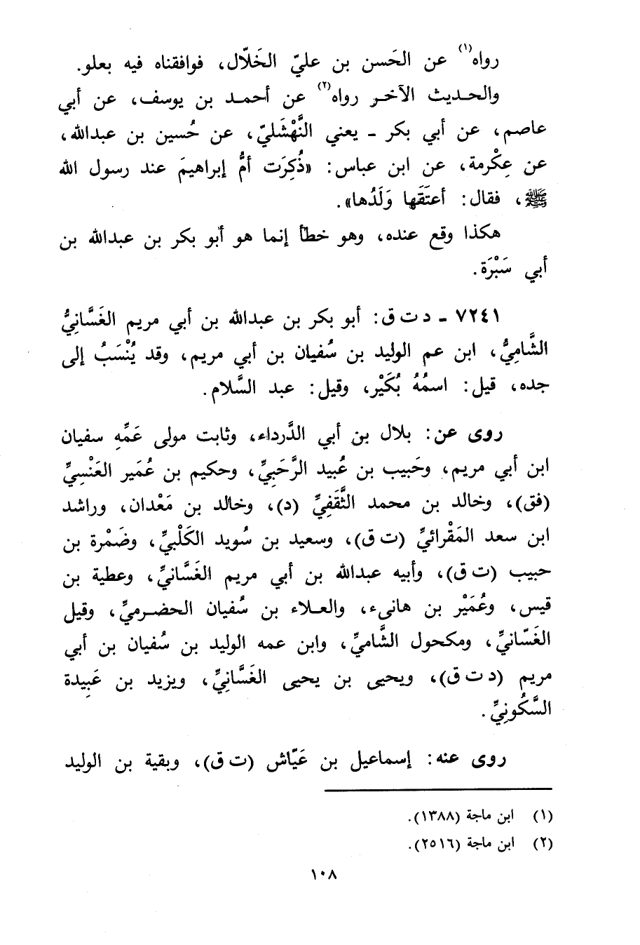 7241 - د ت ق: أَبُو بكر بْن عَبد الله بْن أَبي مريم الغساني الشامي، ابن عم الوليد بْن سفيان بْن أَبي مريم، وقد ينسب إلى جَدِّه، قيل: اسمه بكير، وقيل: عَبْد السلام.