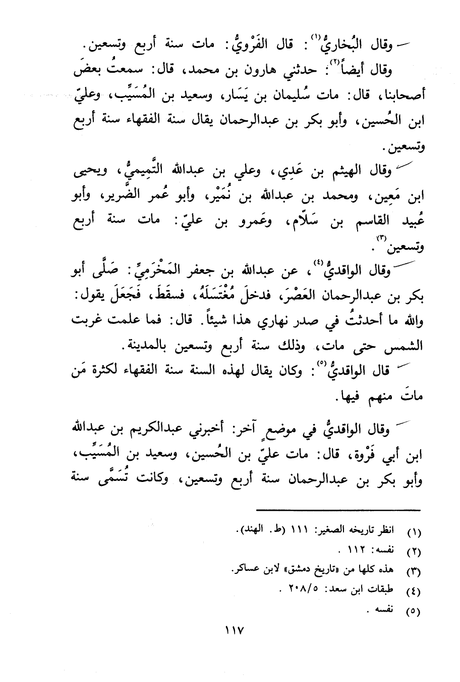 وَقَال الواقدي فِي موضع آخر: أخبرني عَبْد الكريم بْن عَبد الله بن أبلي فروة، قال: مات عَلِيّ بْن الْحُسَيْن، وسَعِيد بْن المُسَيَّب، وأبو بكر بن عبد الرحمن سنة أربع وتسعين، وكانت تسمى سنة