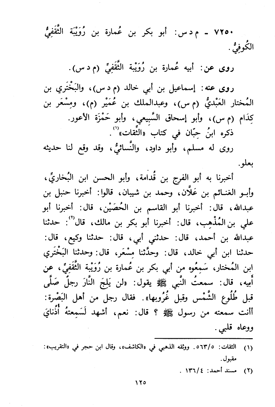 أخبرنا بِهِ أَبُو الْفَرَجِ بْنُ قُدَامَةَ، وأبو الحسن بْن البخاري، وأبو الْغَنَائِمِ بْنُ عَلانَ، وحَمْدُ بْنُ شَيْبَانَ، قَالُوا: أَخْبَرَنَا حَنْبَلُ بْنُ عَبد اللَّهِ، قال: أخبرنا أَبُو القاسم بْن الحصين، قال: أَخْبَرَنَا أبو علي بْن المذهب، قال: أَخْبَرَنَا أبو بكر بْن مالك، قال (2) : حَدَّثَنَا عَبد اللَّهِ بْن أَحْمَدَ، قال: حَدَّثني أبي، قال: حَدَّثَنَا وكِيعٌ، قال: حَدَّثَنَا ابْنُ أَبي خَالِدٍ، قال: وحَدَّثَنَا مِسْعَرٌ، قال: وحَدَّثَنَا البختري ابن الْمُخْتَارِ، سَمِعُوهُ مِنْ أَبِي بَكْرِ بْن عمارة بْن رويبة الثقفي، عَن أَبِيهِ، قال: سَمِعْتُ النَّبِيَّ صَلَّى اللَّهُ عَلَيْهِ وسَلَّمَ يقول: لَنْ يَلِجَ النَّارَ رَجُلٌ صَلَّى قبل طلوع الشمس وقبل غروبها". فَقَالَ رَجُلٌ مِنْ أَهْلِ الْبَصْرَةِ: أأنت سمعته من رَسُولَ صَلَّى اللَّهُ عَلَيْهِ وسَلَّمَ؟ قال: نَعَمْ، أَشْهَدُ لَسَمِعَتْهُ أُذُنَايَ ووعاه قلبي.