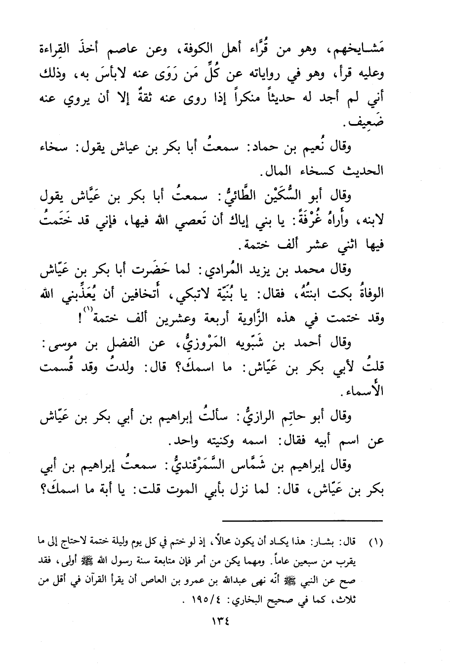 وَقَال أَحْمَد بْن شبويه المروزي، عَنِ الفضل بْن مُوسَى: قلتُ لأبي بكر بْن عياش: ما أسمك؟ قال: ولدت وقد قسمت الأَسماء.