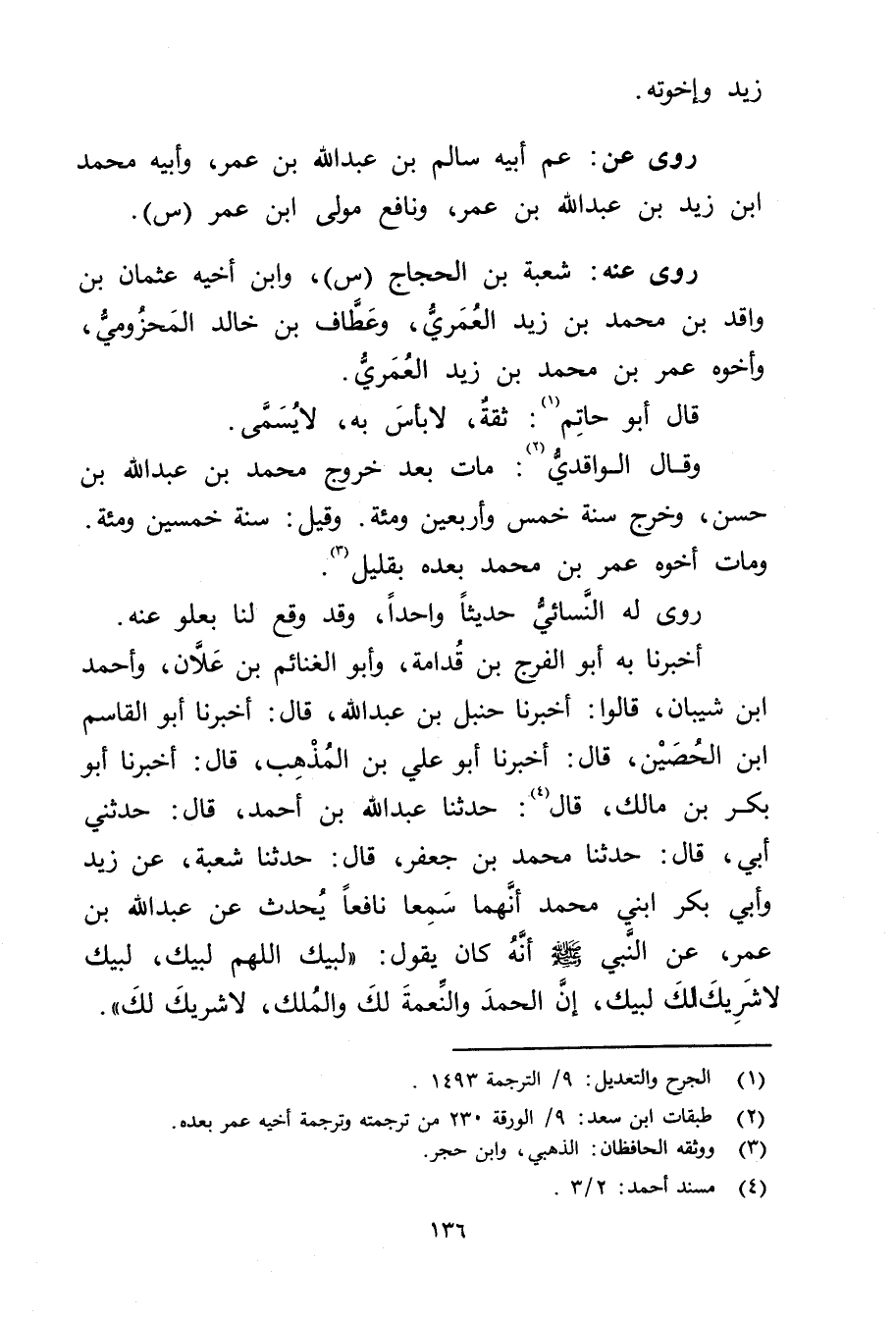 أَخْبَرَنَا بِهِ أَبُو الْفَرَجِ بْنُ قُدَامَةَ، وأَبُو الْغَنَائِمِ بْن علان، وأحمد بْن شيبان، قالوا: أَخْبَرَنَا حنبل بْن عَبد اللَّهِ، قال: أخبرنا أَبُو الْقَاسِمِ ابن الحصين، قال: أخبرنا أَبُو علي بْن المذهب، قال: أَخْبَرَنَا أبو بكر بْن مالك، قال (4) : حَدَّثَنَا عَبد اللَّهِ بْنُ أَحْمَدَ، قال: حَدَّثني أبي، قال: حَدَّثَنَا مُحَمَّدُ بْنُ جَعْفَرٍ، قال: حَدَّثَنَا شُعْبَةُ، عَنْ زَيْدٍ وأَبِي بَكْرِ بني مُحَمَّدٍ أَنَّهُمَا سَمِعَا نَافِعًا يُحَدِّثُ عن عَبد الله بْن عُمَر، عَنِ النَّبِيِّ صلى الله عليه وسَلَّمَ أَنَّهُ كَانَ يَقُولُ: لَبَّيْكَ اللَّهُمَّ لَبَّيْكَ، لَبَّيْكَ لا شَرِيك لَكَ لَبَّيْكَ، إِنَّ الْحَمْدَ والنِّعْمَةَ لَكَ والْمُلْكَ، لا شَرِيك لَكَ.
