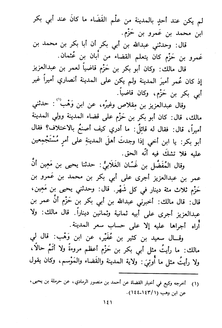 (1) أخرجه وكيع في أخبار القضاة عَنْ أَحْمَدَ بْنِ مَنْصُورٍ الرَّمَادِيِّ، عَنْ حَرْمَلَة بْن يَحْيَى، عَنِ ابن وهب (1 / 143 - 144) .