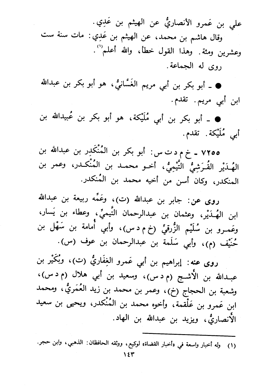 7255 - خ م د ت س: أَبُو بكر بن المنكدر بن عَبد اللَّه بن الهدير القرشي التَّيْمِيّ، أخو مُحَمَّد بْن المنكدر، وعُمَر بْن المنكدر، وكان أسن من أخيه مُحَمَّد بْن المنكدر.