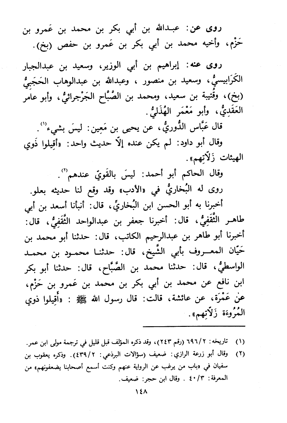 أَخْبَرَنَا بِهِ أَبُو الْحَسَنِ بْنُ الْبُخَارِيِّ، قال: أَنْبَأَنَا أَسْعَدُ بْنُ أَبي طَاهِرٍ الثَّقَفِيُّ، قال: أَخْبَرَنَا جَعْفَرُ بْنُ عَبْدِ الْوَاحِدِ الثَّقَفِيُّ، قال: أَخْبَرَنَا أَبُو طَاهِرِ بْنِ عَبد الرَّحِيمِ الْكَاتِبُ، قال: حَدَّثَنَا أَبُو مُحَمَّد بْن حيان الْمَعْرُوفُ بِأَبِي الشَّيْخِ، قال: حَدَّثَنَا مَحْمُودُ بْنُ مُحَمَّدٍ الْوَاسِطِيُّ، قال: حَدَّثَنَا مُحَمَّدُ بْنُ الصَّبَّاحِ، قال: حَدَّثَنَا أَبُو بَكْرِ بْنُ نَافِعٍ عَنْ مُحَمَّد بْن أَبي بَكْر بْن مُحَمَّد بْن عَمْرو بْن حَزْمٍ، عَنْ عُمَرة، عَنْ عَائِشَةَ، قَالَتْ: قال رَسُولُ اللَّهِ صلى الله عليه وسلم: أَقِيلُوا ذَوِي المروءة زلاتهم.