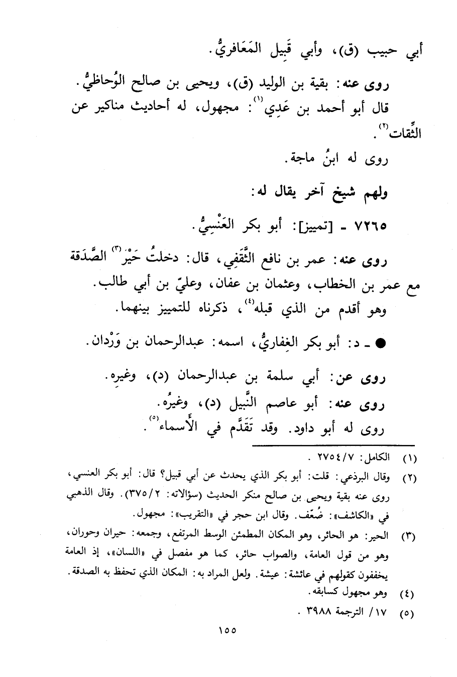 (2) وَقَال البرذعي: قلت: أبو بكر الذي يحدث عَن أبي قبيل؟ قال: أَبُو بكر العنسي، روى عنه بقية ويحيى بن صالح منكر الحديث (سؤالاته: 2 / 375) . وَقَال الذهبي في " الكاشف": ضعف. وَقَال ابن حجر في "التقريب": مجهول.