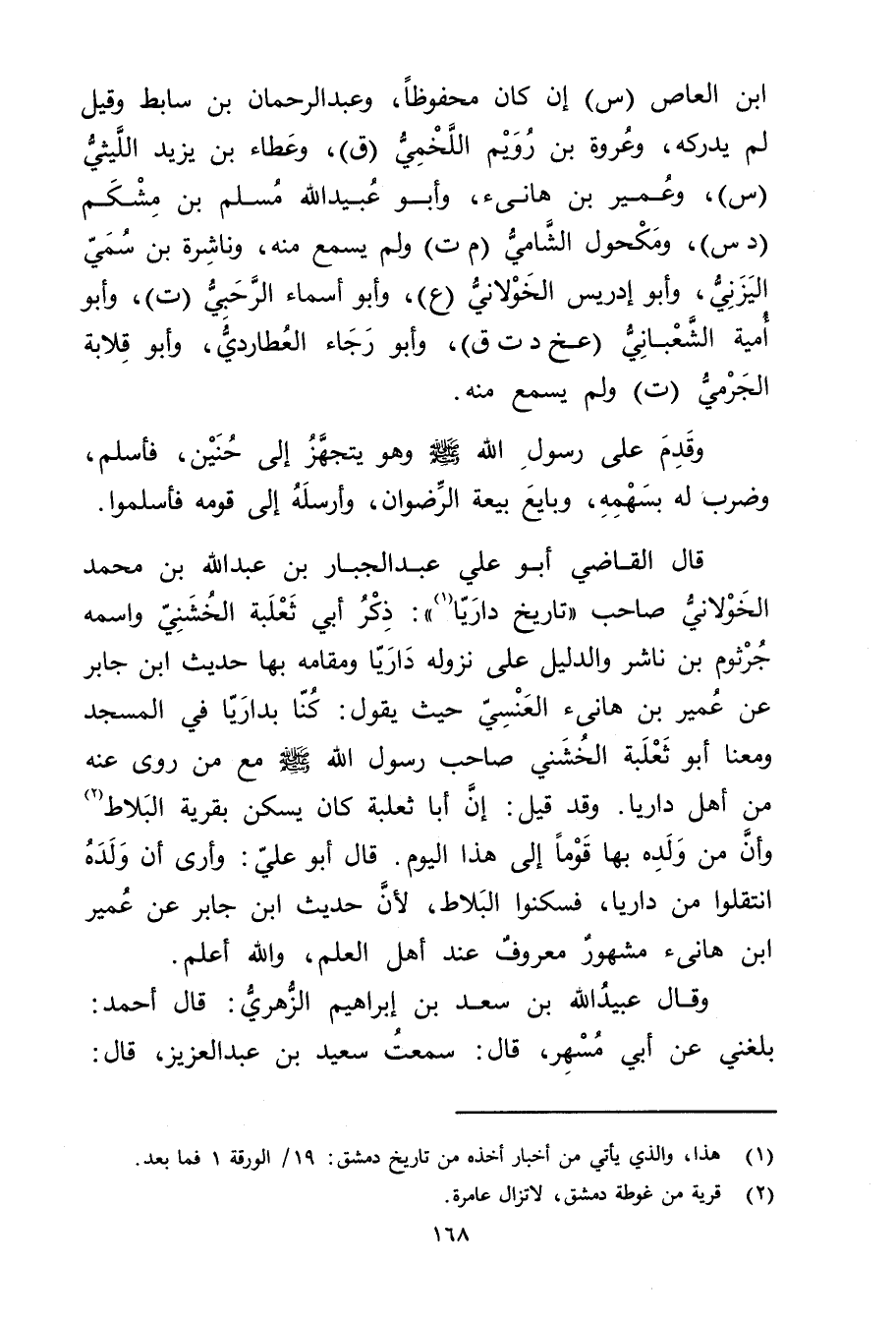 قال الْقَاضِي أَبُو علي عبد الجبار بْن عَبد اللَّه بْن مُحَمَّد الخولاني صاحب" تاريخ داريا (1) ": ذكر أَبِي ثعلبة الخشني واسمه جرثوم بْن ناشر والدليل على نزوله داريا ومقامه بها حديث ابن جابر عَنْ عُمَير بْنِ هَانِئٍ الْعَنْسِيِّ حيث يقول: كنا بداريا فِي المسجد ومعنا أَبُو ثعلبة الخشني صاحب رَسُول اللَّهِ صلى الله عليه وسلم مع من روى عنه من أهل داريا. وقد قيل: إن أبا ثعلبة كان يسكن بقرية البلاط (2) وإن من ولده بها قوما" إلى هذا اليوم. قال أَبُو عَلِيّ: وأرى أن ولده انتقلوا من داريا، فسكنوا البلاط، لأن حديث ابن جابر عن عُمَير ابن هانئ مشهور معروف عند أهل العلم، والله أعلم.