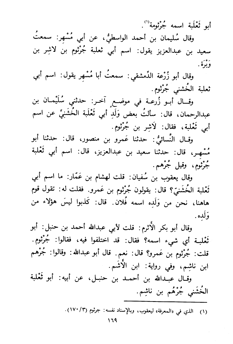 وَقَال يعقوب بْن سُفْيَان: قلت لهشام بْن عمار: ما اسم أَبِي ثعلبة الخشني؟ قال: يقولون جرثوم بْن عَمْرو. فقلت له: تقول قوم هاهنا، نحن من ولده اسمه فلان. قال: كذبوا ليس هؤلاء من ولده.