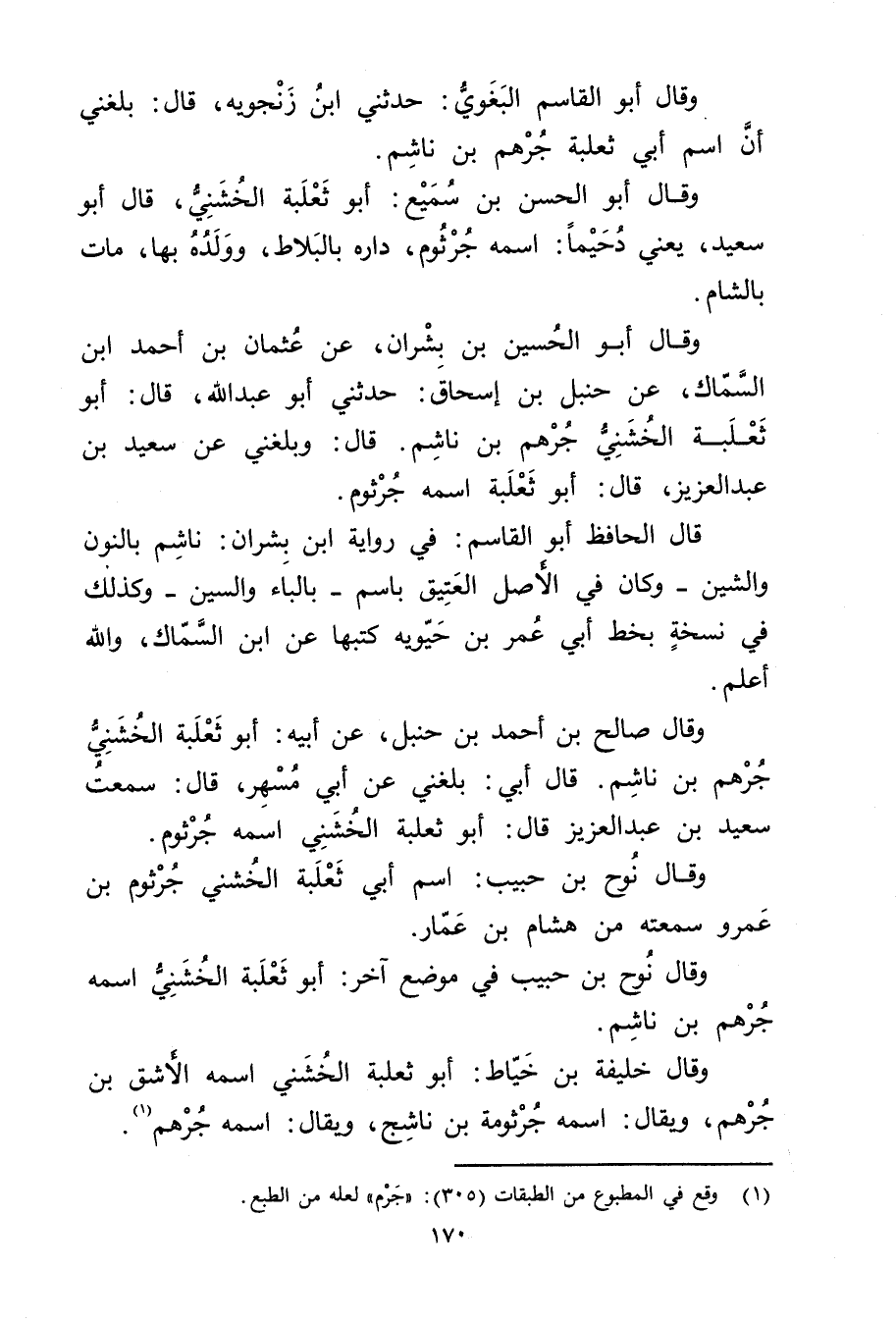 وَقَال أَبُو الْحُسَيْن بْن بشران، عَنْ عثمان بْن أَحْمَد بن السماك، عن حنبل بن إِسْحَاقَ: حَدَّثَنِي أَبُو عَبْد اللَّهِ، قال: أَبُو ثعلبة الخشني جرهم بْن ناشم. قال: وبلغني عَنْ سَعِيد بْن عبد العزيز، قال: أَبُو ثعلبة اسمه جرثوم.