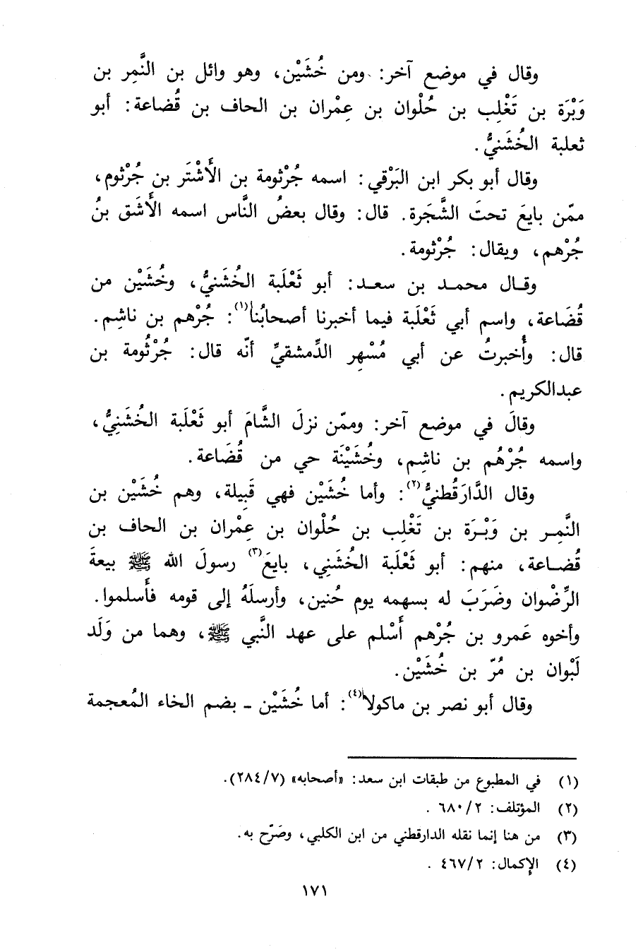 وَقَال فِي موضع آخر: ومن خشين، وهو وائل بْن النمر بْن وبرة بْن تغلب بْن حلوان بْن عِمْران بْن الحاف بْن قضاعة: أَبُو ثعلبة الخشني.