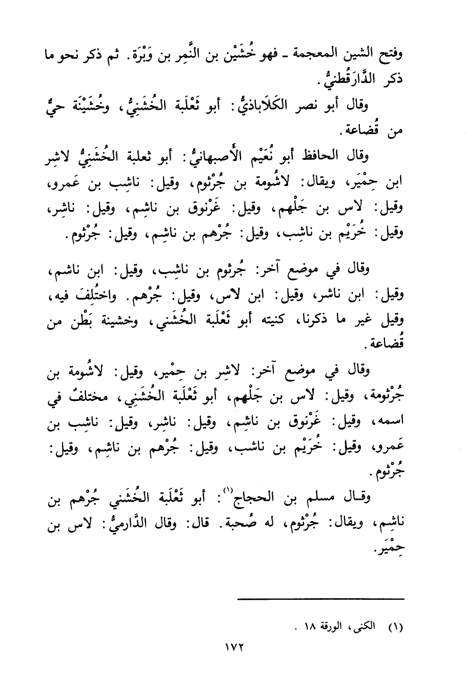 وَقَال فِي موضع آخر: لاشر بْن حمير، وقيل: لاشومة بْن جرثومة، وقيل: لاس بْن جلهم، أَبُو ثعلبة الخشني، مختلف فِي اسمه، وقيل: غرنوق بْن ناشم، وقيل: ناشر، وقيل: ناشب بْن عَمْرو، وقيل: خريم بْن ناشب، وقيل: جرهم بْن ناشم، وقيل: جرثوم.