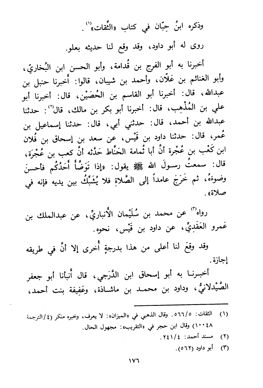 أَخْبَرَنَا بِهِ أَبُو الْفَرَجِ بْنُ قُدَامَةَ، وأَبُو الْحَسَنِ بْنُ الْبُخَارِيِّ، وأبو الغنائم بْن علان، وأحمد بْنُ شَيْبَانَ، قَالُوا: أَخْبَرَنَا حَنْبَلُ بْن عَبد الله، قال: أَخْبَرَنَا أبو القاسم بْن الحصين، قال: أَخْبَرَنَا أبو علي بْن المذهب، قال: أَخْبَرَنَا أبو بكر بْن مالك، قال (2) : حَدَّثَنَا عَبد الله بْن أَحْمَدَ، قال: حَدَّثني أبي، قال: حَدَّثَنَا إِسْمَاعِيلُ بْنُ عُمَر، قال: حَدَّثَنَا دَاوُدُ بْنُ قَيْسٍ، عن سَعْدِ بْنِ إِسْحَاقَ بْنِ فُلانِ ابْنِ كَعْبِ بْنِ عُجْرَةَ أَنَّ أَبَا ثُمَامَةَ الْحَنَّاطَ حَدَّثَهُ أَنَّ كَعْبَ بْنَ عُجْرَةَ، قال: سمعت رَسُول اللَّهِ صَلَّى اللَّهُ عَلَيْهِ وسَلَّمَ يَقُولُ: إِذَا تَوَضَّأَ أَحَدُكُمْ فَأَحْسَنَ وضُوءَهُ، ثُمَّ خَرَجَ عَامِدًا" إِلَى الصَّلاةِ فَلا يُشَبِّكُ بَيْنَ يَدَيْهِ فَإِنَّهُ فِي صَلاةٍ.