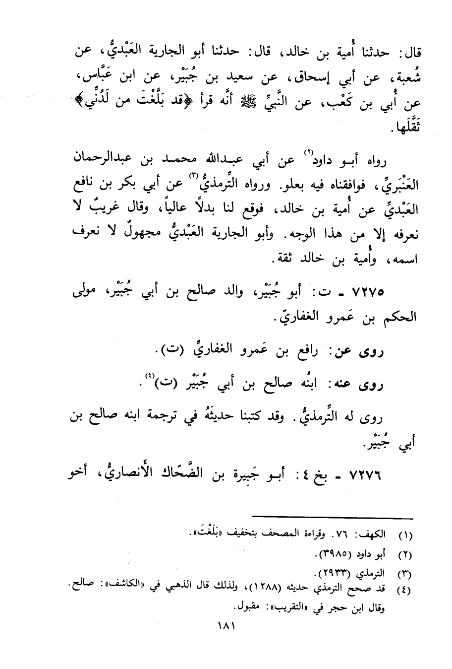 قال: حَدَّثَنَا أمية بْن خالد، قال: حَدَّثَنَا أَبُو الْجَارِيَةِ الْعَبْدِيُّ، عن شعبة، عَن أَبِي إِسْحَاقَ، عَنْ سَعِيد بْنِ جُبَيْرٍ، عَنْ ابن عباس، عَن أبي بْن كَعْبٍ، عَنِ النَّبِيِّ صَلَّى اللَّهُ عَلَيْهِ وسَلَّمَ أَنَّهُ قَرَأَ {قَدْ بَلَغْتَ مِنْ لَدُنِّي} ثَقَّلَهَا.