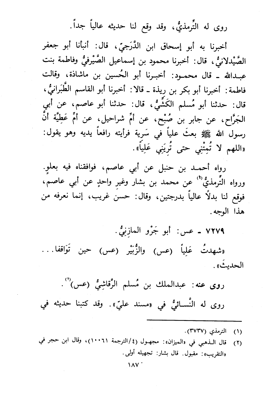 أَخْبَرَنَا بِهِ أَبُو إِسْحَاقَ ابْنُ الدَّرَجِيِّ، قال: أنبأنا أَبُو جَعْفَرٍ الصَّيْدَلانِيُّ، قال: أَخْبَرَنَا مَحْمُودُ بْنُ إِسْمَاعِيلَ الصَّيْرَفِيُّ وفَاطِمَةُ بِنْتُ عَبد اللَّهِ، قال محمود: أخبرنا أبو الحسين بن ما شاذة، وَقَالت فَاطِمَةُ: أخبرنا أَبُو بَكْرٍ بْنُ رِيذَةَ - قَالا: أخبرنا أَبُو الْقَاسِمِ الطَّبَرَانِيُّ، قال: حَدَّثَنَا أَبُو مُسْلِمٍ الْكَشِّيُّ، قال: حَدَّثَنَا أَبُو عَاصِمٍ، عَن أَبِي الْجَرَّاحِ، عَنْ جَابِرِ بْنِ صُبْحٍ، عَنْ أُمِّ شُرَاحِيلَ، عَنْ أُمِّ عَطِيَّةَ أَنَّ رَسُول اللَّهِ صلى الله عليه وسَلَّمَ بَعَثَ عَلِيًّا" فِي سَرِّيَةٍ فرأيته رافعا" يديه وهو يقول: اللَّهُمَّ لا تُمِتْنِي حَتَّى تُرِيَنِي عَلِيًّا.