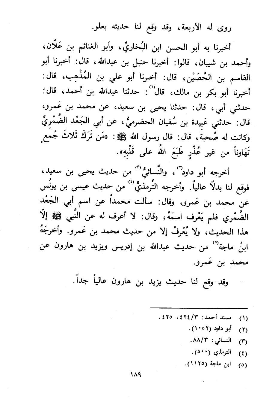 أخبرنا به أَبُو الحسن بْن البخاري، وأبو الغنائم بْن علان، وأحمد بْن شَيْبَانَ، قَالُوا: أَخْبَرَنَا حَنْبَلُ بْنُ عَبد اللَّهِ، قال: أخبرنا أَبُو القاسم بْن الحصين، قال: أَخْبَرَنَا أبو علي بْن المذهب، قال: أَخْبَرَنَا أبو بكر بْن مالك، قال (1) : حَدَّثَنَا عَبد اللَّهِ بْن أَحْمَدَ، قال: حَدَّثني أبي، قال: حَدَّثَنَا يَحْيَى بْنُ سَعِيد، عن مُحَمَّدِ بْنِ عَمْرو، قال: حَدَّثَنِي عُبَيدة بْنُ سُفْيَانَ الْحَضْرَمِيُّ، عَن أَبِي الْجَعْدِ الضَّمْرِيِّ وكَانَتْ لهُ صُحبَةٌ، قال: قال رَسُولُ اللَّهِ صلى الله عليه وسلم: من تَرَكَ ثَلاثَ جُمَعٍ تَهَاوُنًا" مِنْ غَيْرِ عُذْرٍ طَبَعَ اللَّهُ عَلَى قَلْبِهِ.