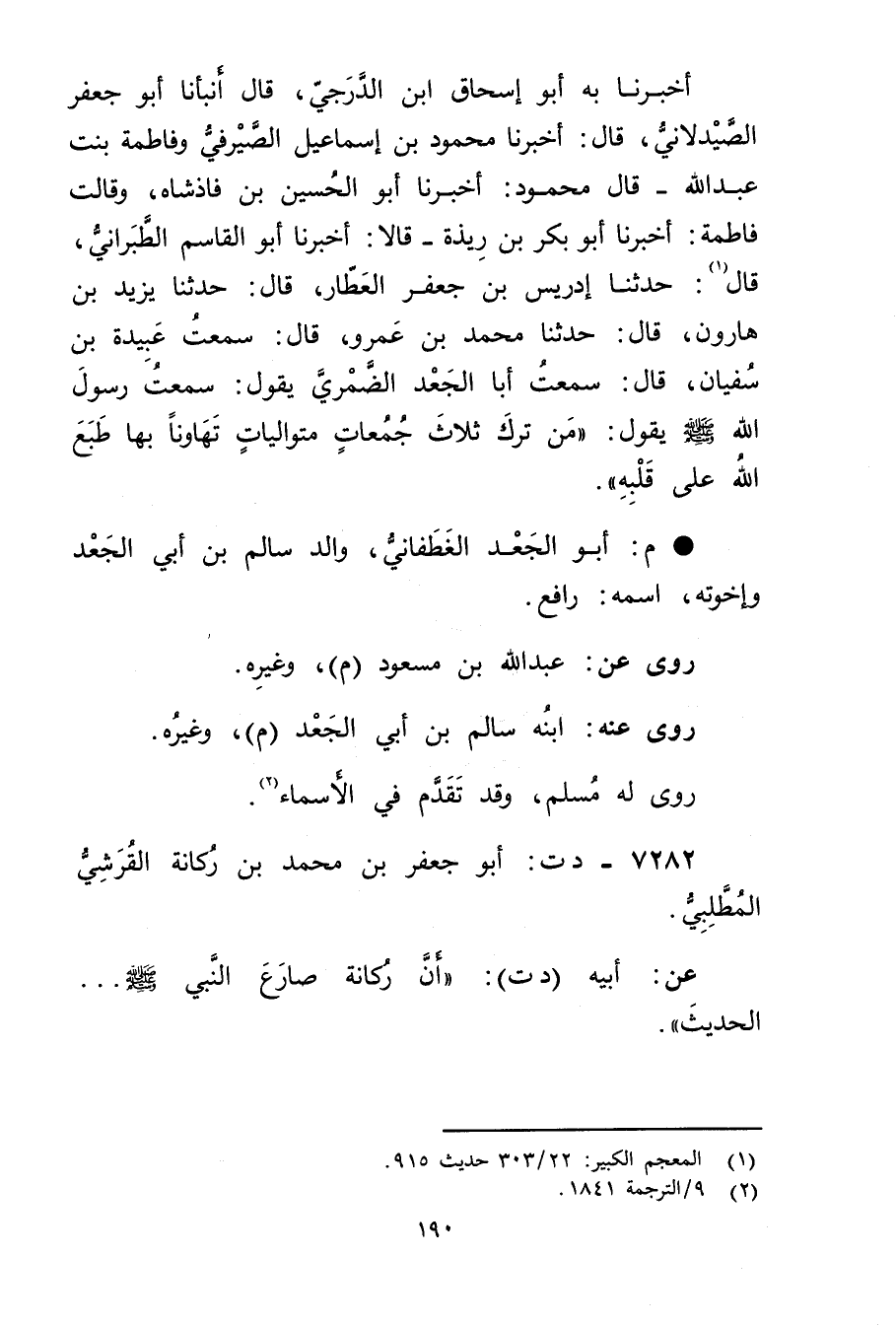 أَخْبَرَنَا بِهِ أَبُو إِسْحَاقَ ابْنُ الدَّرَجِيِّ، قال أنبأنا أَبُو جَعْفَرٍ الصَّيْدَلانِيُّ، قال: أَخْبَرَنَا مَحْمُودُ بْنُ إِسْمَاعِيلَ الصَّيْرَفِيُّ وفَاطِمَةُ بِنْتُ عَبد الله، قال محمود: أخبرنا أبو الْحُسَيْنِ بْنُ فَاذشَاهِ، وَقَالت فَاطِمَةُ: أخبرنا أَبُو بَكْرِ بْنُ رِيذَةَ - قَالا: أخبرنا أَبُو الْقَاسِمِ الطَّبَرَانِيُّ، قال (1) : حَدَّثَنَا إِدْرِيسُ بْنُ جَعْفَرٍ الْعَطَّارُ، قال: حَدَّثَنَا يَزِيدُ بْنُ هَارُونَ، قال: حَدَّثَنَا مُحَمَّدُ بْنُ عَمْرو، قال: سَمِعْتُ عُبَيدة بْنَ سُفْيَانَ، قال: سَمِعْتُ أَبَا الْجَعْدِ الضَّمْرِيَّ يَقُولُ: سَمِعْتُ رَسُولَ اللَّهِ صَلَّى اللَّهُ عَلَيْهِ وسَلَّمَ يقول: مَنْ تَرَكَ ثَلاثَ جُمُعَاتٍ مُتَوَالِيَاتٍ تَهَاوُنًا" بِهَا طَبَعَ اللَّهُ عَلَى قَلْبِهِ.