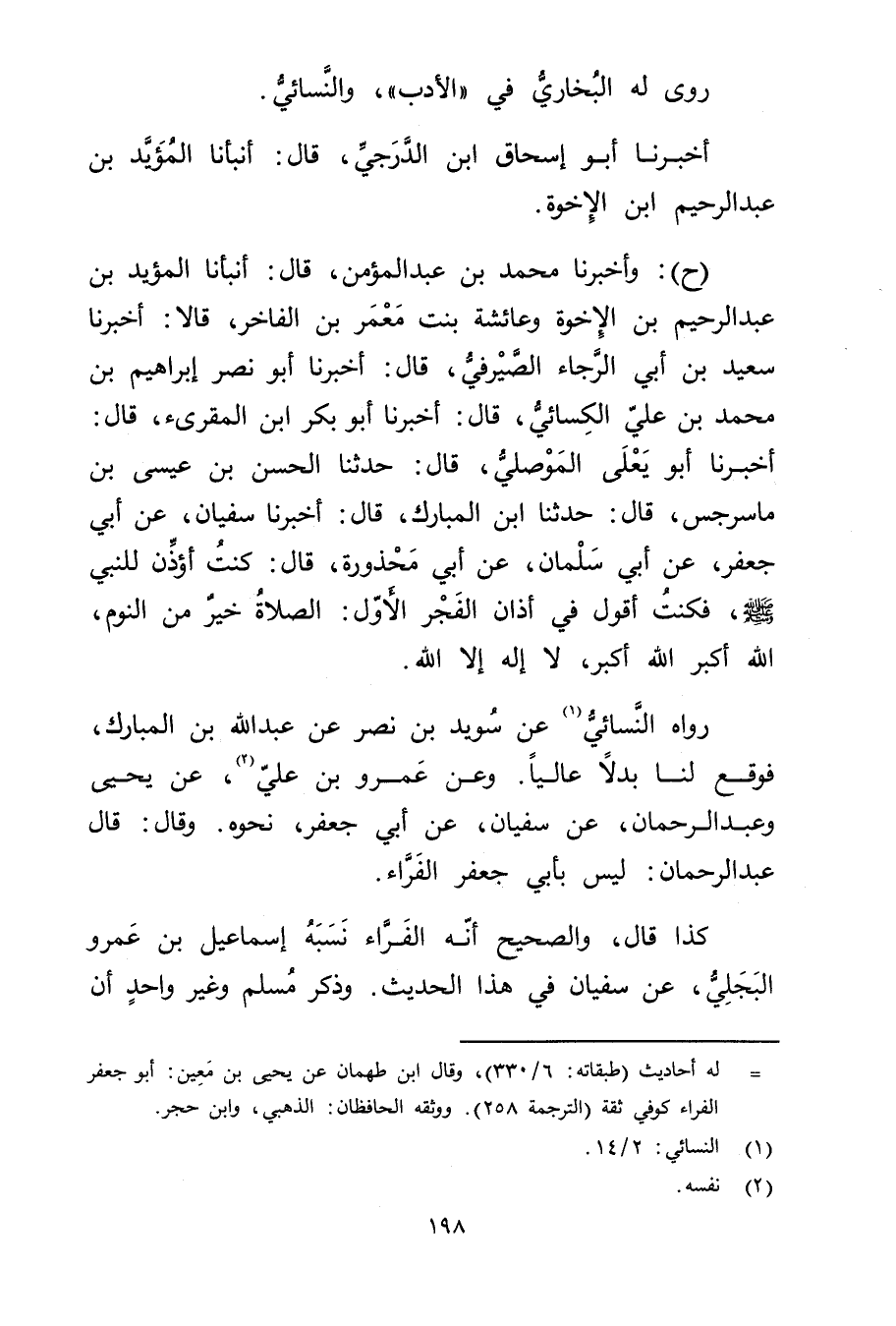 رَوَاهُ النَّسَائي (1) عَنْ سويد بْن نصر عَنْ عَبد اللَّهِ بْنِ الْمُبَارَكِ، فَوَقَعَ لَنَا بَدَلا عَالِيًا". وعن عَمْرو بْن عَلِيّ (2) ، عَنْ يَحْيَى وعبد الرحمن، عَنْ سفيان، عَن أَبِي جعفر، نحوه. وَقَال: قال عَبْد الرحمن: ليس بأبي جعفر الفراء.