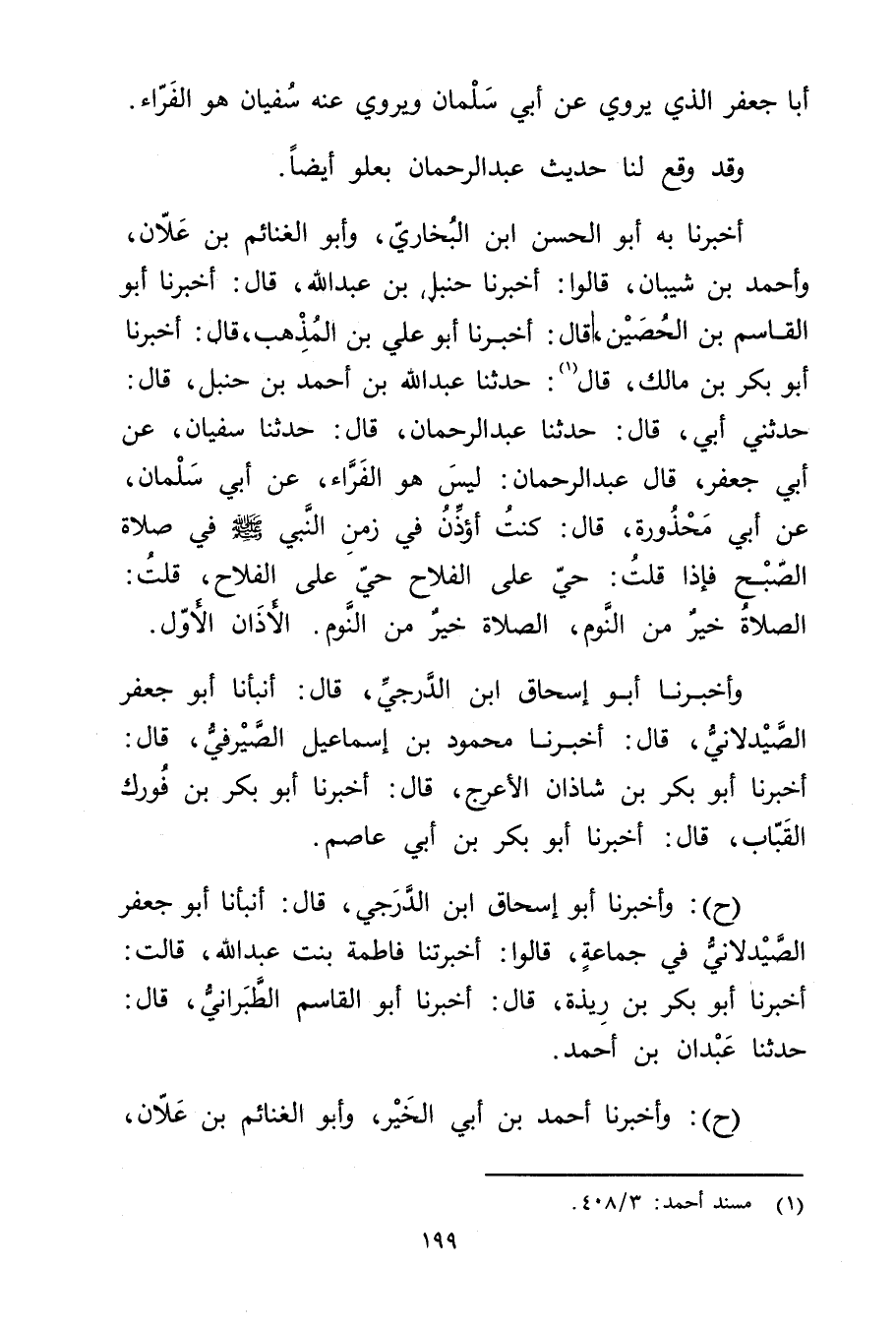 أخبرنا بِهِ أَبُو الْحَسَنِ بْنُ الْبُخَارِيِّ، وأَبُو الْغَنَائِمِ بْنُ عَلانَ، وأَحْمَدُ بْنُ شَيْبَانَ، قَالُوا: أَخْبَرَنَا حنبل بْن عَبد الله، قال: أَخْبَرَنَا أبو القاسم بْن الحصين، قال: أَخْبَرَنَا أَبُو علي بْن المذهب، قال: أَخْبَرَنَا أبو بكر بْن مالك، قال (1) : حَدَّثَنَا عَبد اللَّهِ بْن أَحْمَد بْن حنبل، قال: حَدَّثني أبي، قال: حَدَّثَنَا عَبْد الرَّحْمَن، قال: حَدَّثَنَا سفيان، عَن أَبِي جَعْفَرٍ، قال عَبْدُ الرَّحْمَنِ: لَيْسَ هُوَ الْفَرَّاءُ، عَن أَبِي سَلْمَانَ، عَن أَبِي مَحْذُورَةَ، قال: كُنْتُ أُؤَذِّنُ فِي زَمَنِ النَّبِيُّ صلى الله عليه وسلم فِي صَلاةِ الصُّبْحِ فَإِذَا قُلْتُ: حَيَّ عَلَى الْفَلاحِ حَيَّ عَلَى الْفَلاحِ، قُلْتُ: الصَّلاةُ خَيْرٌ مِنَ النَّوْمِ، الصَّلاةُ خَيْرٌ مِنَ النَّوْمِ. الأَذَانُ الأَّوَلُ.