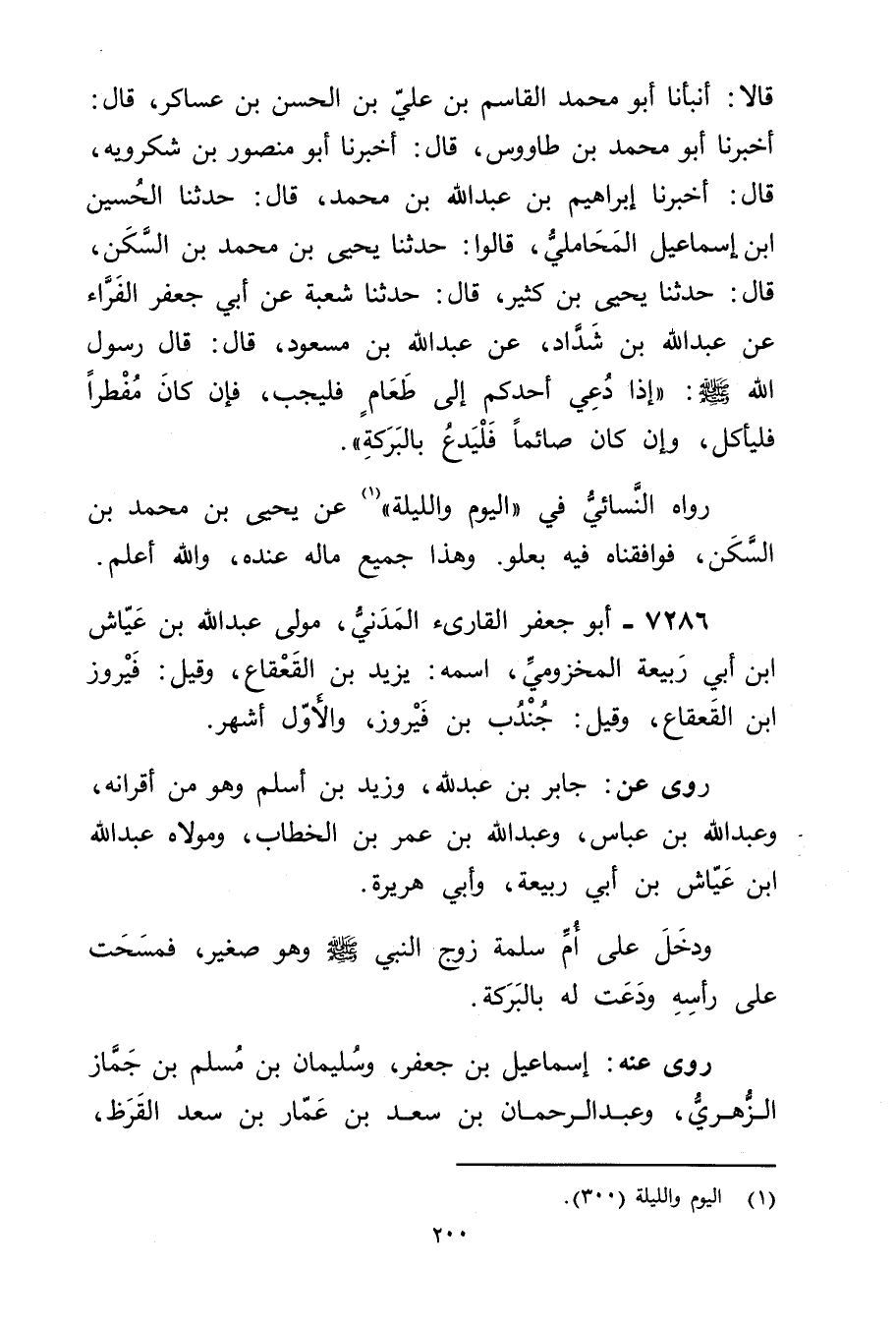 قَالا: أَنْبَأَنَا أَبُو مُحَمَّدٍ الْقَاسِمُ بْن علي بْن الْحَسَن بْن عَسَاكِرَ، قال: أَخْبَرَنَا أَبُو مُحَمَّدِ بن طاووس، قال: أخبرنا أَبُو منصور بْن شُكْرَوَيْهِ، قال: أَخْبَرَنَا إِبْرَاهِيمُ بْنُ عَبد اللَّهِ بْن مُحَمَّد، قال: حَدَّثَنَا الحسين ابن إِسْمَاعِيلَ الْمَحَامِلِيُّ، قَالُوا: حَدَّثَنَا يَحْيَى بْن مُحَمَّدِ بْن السكن، قال: حَدَّثَنَا يَحْيَى بْن كثير، قال: حَدَّثَنَا شُعْبَةُ عَن أَبِي جَعْفَرٍ الْفَرَّاءِ عَنْ عَبد اللَّهِ بْنِ شداد، عَنْ عَبد اللَّهِ بْن مَسْعُودٍ، قال: قال رَسُولُ اللَّهِ صلى الله عليه وسلم: إِذَا دُعِيَ أَحَدُكُمْ إِلَى طَعَامٍ فَلْيُجِبْ، فَإِنْ كَانَ مُفْطِرًا" فَلْيَأْكُلْ، وإِنْ كان صائما" فليدع بالبركة.