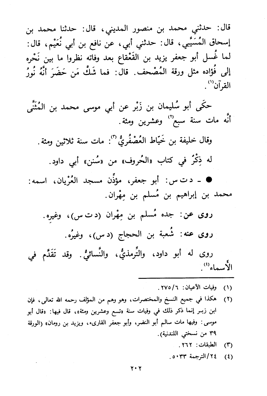 (2) هكذا في جميع النسخ والمختصرات، وهو وهم من المؤلف رحمه الله تعالى، فإن ابن زبر إنما ذكر ذلك في وفيات سنة" تسع وعشرين ومئة"، قال فيها: قال أبو موسى: وفيها مات سالم أبو النضر، وأبو جعفر القارئ، ويزيد بن رومان" (الورقة 39 من نسختي اللندنية) .