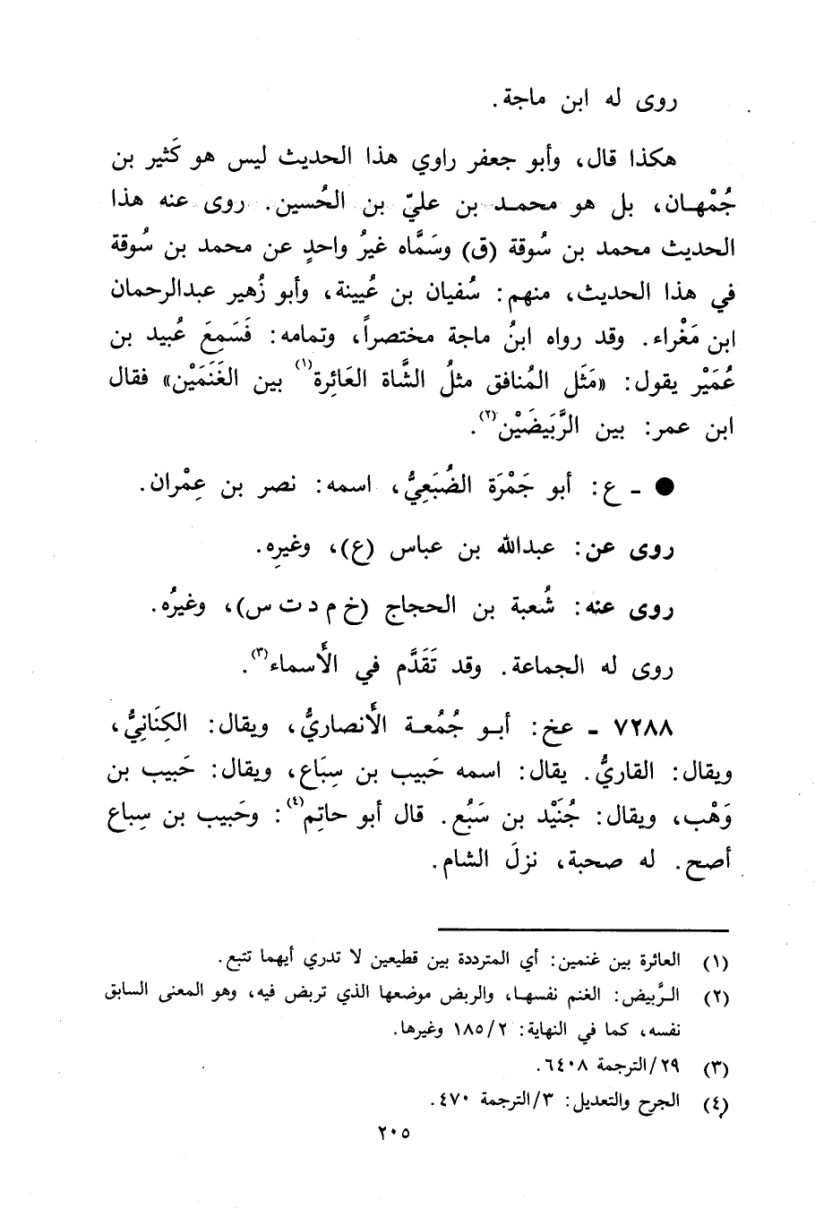 هكذا قال، وأبو جعفر راوي هذا الحديث ليس هو كثير بْن جمهان، بل هو مُحَمَّد بْن عَلِيّ بْن الْحُسَيْن. روى عنه هذا الحديث مُحَمَّد بْن سوقة (ق) وسماه غير واحد عَنْ مُحَمَّد بْن سوقة فِي هذا الحديث، منهم: سفيان بْن عُيَيْنَة، وأبو زهير عبد الرحمن ابن مغراء. وقد رواه ابن ماجه مختصرا"، وتمامه: فسمع عُبَيد بْن عُمَير يقول: مثل المنافق مثل الشاة العائرة (1) بين الغنمين" فقال ابن عُمَر: بين الربيضين (2) .