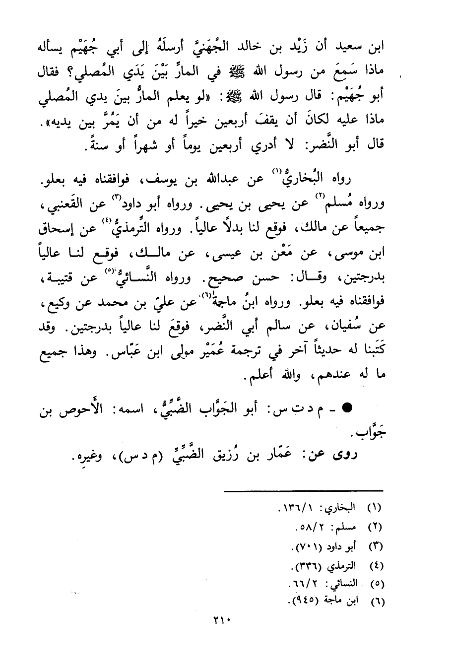 ابن سَعِيد أَنَّ زَيْدَ بْنَ خَالِدٍ الْجُهَنِيَّ أَرْسَلَهُ إِلَى أَبِي جُهَيْمٍ يَسْأَلُهُ مَاذَا سَمِعَ مِنْ رَسُولِ اللَّهِ صلى الله عليه وسلم فِي الْمَارِّ بَيْنَ يَدَيِ الْمُصَلِّي؟ فَقَالَ أَبُو جُهَيْمٍ: قال رَسُولُ اللَّهِ صلى الله عليه وسلم: لَوْ يَعْلَمُ الْمَارُّ بَيْنَ يَدَيِ الْمُصَلِّي مَاذَا عَلَيْهِ لَكَانَ أَنْ يَقِفَ أَرْبَعِينَ خَيْرًا" لَهُ مِنْ أَنْ يَمُرَّ بَيْنَ يَدَيْهِ.