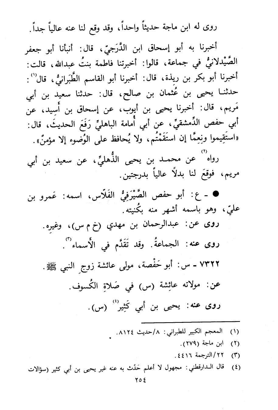 أَخْبَرَنَا بِهِ أَبُو إِسْحَاقَ ابْنُ الدَّرَجِيِّ، قال: أَنْبَأَنَا أَبُو جعفر الصَّيْدَلانِيّ فِي جماعة، قَالُوا: أَخْبَرَتْنا فَاطِمَةُ بِنْتُ عَبد اللَّهِ، قَالَتْ: أخبرنا أَبُو بَكْرِ بْنِ رِيذَةَ، قال: أخبرنا أَبُو الْقَاسِمِ الطَّبَرَانِيُّ، قال (1) : حَدَّثَنَا يَحْيَى بْنُ عُثْمَانَ بْنِ صَالِحٍ، قال: حَدَّثَنَا سَعِيد بْن أَبي مريم، قال: أخبرنا يَحْيَى بْنُ أَيُّوبَ، عَنْ إِسْحَاقَ بْنِ أُسَيْدٍ، عَن أَبِي حَفْصٍ الدِّمَشْقِيِّ، عَن أَبِي أُمَامَةَ الْبَاهِلِيِّ رَفَعَ الْحَدِيثَ، قال: اسْتَقِيمُوا ونِعِمَّا إِنِ اسْتَقَمْتُمْ، ولا يُحَافِظُ عَلَى الْوُضُوءِ إِلا مُؤْمِنٌ.