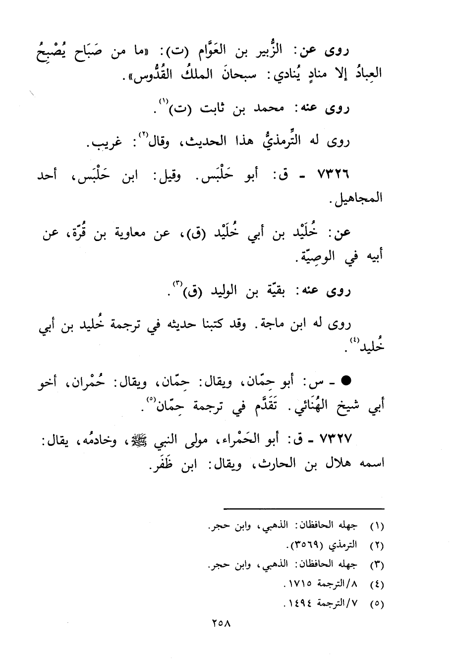 رَوَى عَن: الزبير بْن العوام (ت) : ما من صباح يصبح العباد إِلا مناد ينادي: سبحان الملك القدوس.