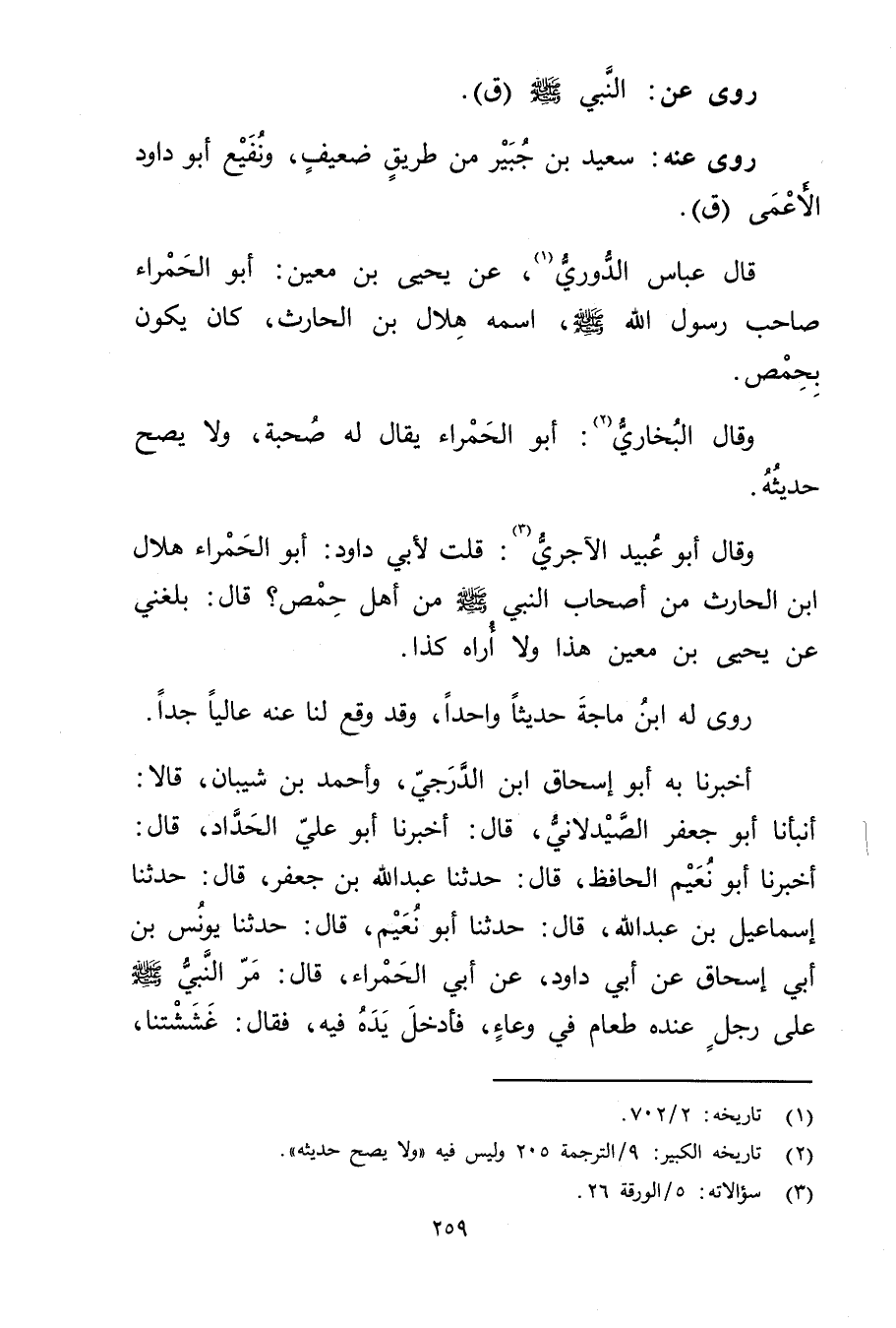 وَقَال أَبُو عُبَيد الآجُرِّيّ (3) : قلتُ لأبي داود: أبو الحمراء هلال ابن الحارث من أصحاب النَّبِيّ صَلَّى اللَّهُ عَلَيْهِ وسَلَّمَ من أهل حمص؟ قال: بلغني عَنْ يَحْيَى بْن مَعِين هذا ولا أراه كذا.