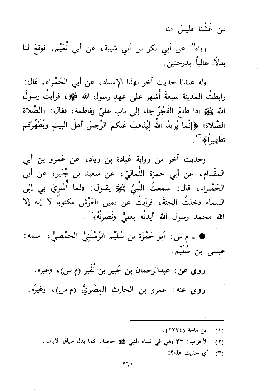 وله عندنا حديث آخر بهذا الإسناد، عَن أَبِي الْحَمْرَاءِ، قال: رَابَطْتُ الْمَدِينَةَ سَبْعَةَ أَشْهُرٍ عَلَى عَهْدِ رَسُول اللَّهِ صلى الله عليه وسَلَّمَ، فَرَأَيْتُ رَسُولَ اللَّهِ صَلَّى اللَّهُ عَلَيْهِ وسَلَّمَ إِذَا طَلَعَ الْفَجْرُ جَاءَ إِلَى بَابِ عَلِيٍّ وفَاطِمَةَ، فَقَالَ: الصَّلاةَ الصَّلاةَ" {إِنَّمَا يُرِيدُ اللَّهُ لِيُذْهِبَ عَنْكُمُ الرِّجْسَ أَهْلَ الْبَيْتِ ويُطَهِّرَكُمْ تَطْهِيرًا") {2) .