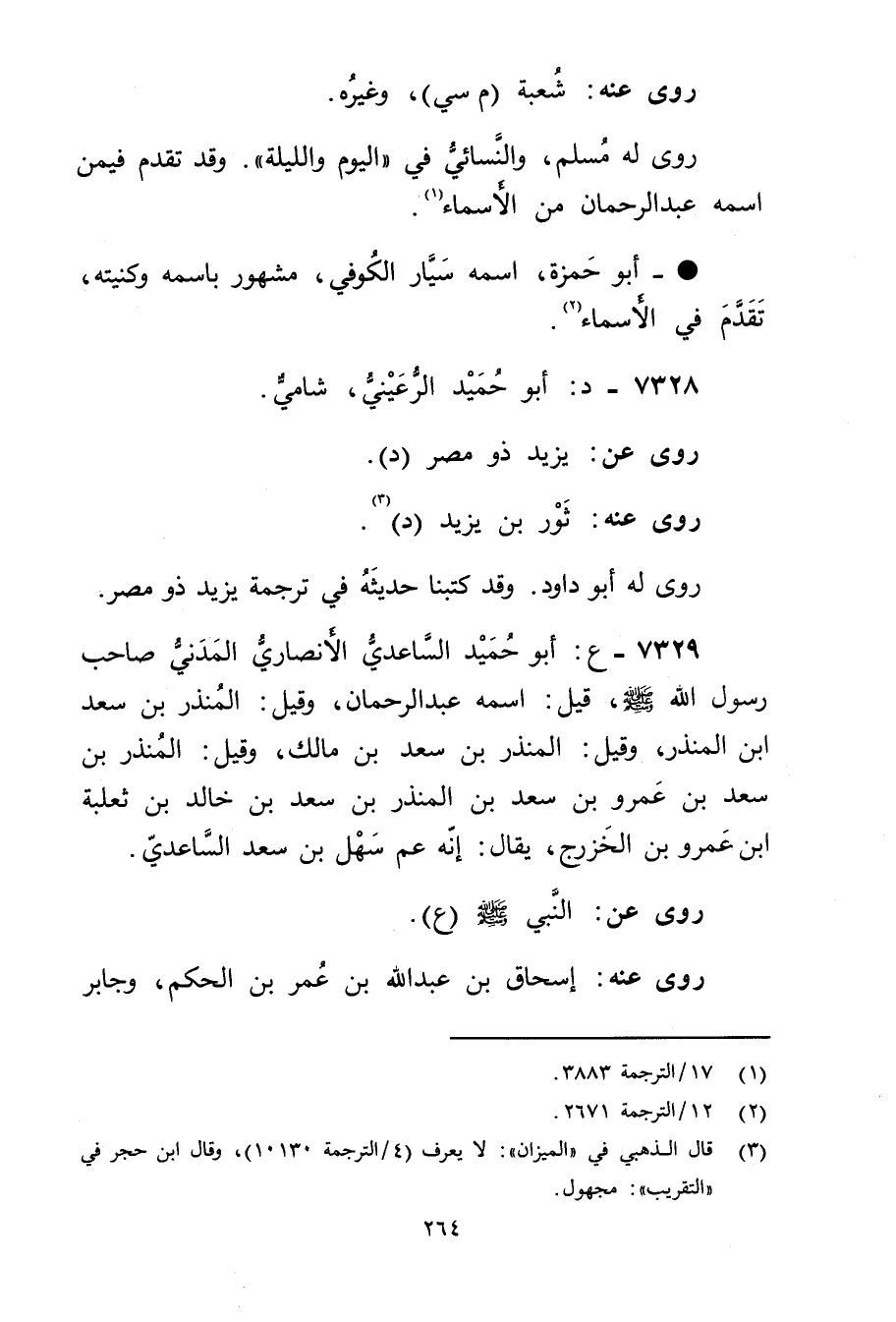 7329 - ع: أَبُو حميد الساعدي الأَنْصارِيّ الْمَدَنِيّ صاحب رَسُول اللَّهِ صَلَّى اللَّهُ عَلَيْهِ وسَلَّمَ، قِيلَ: اسمه عَبْد الرحمن، وقيل: المنذر بن سعد ابن المنذر، وقيل: المنذر بْن سعد بْن مالك، وقيل: المنذر بْن سعد بْن عَمْرو بْن سعد بْن المنذر بْن سعد بْن خالد بْن ثعلبة ابن عَمْرو بْن الخزرج، يقال: أنه عم سهل بْن سعد الساعدي.