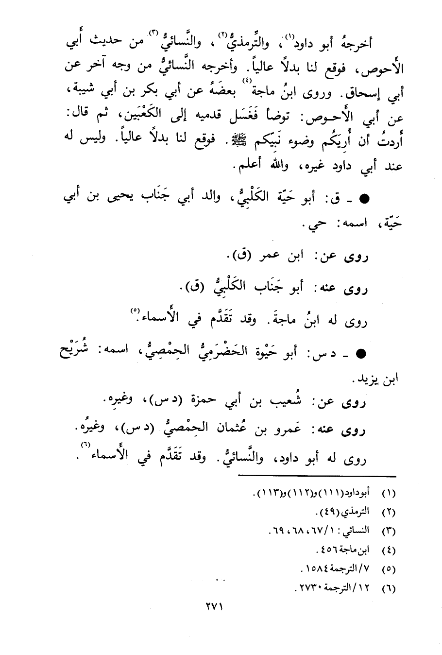 أَخْرَجَهُ أَبُو دَاوُدَ (1) ، والتِّرْمِذِيّ (2) ، والنَّسَائي (3) مِنْ حَدِيثِ أَبِي الأَحوص، فَوَقَعَ لَنَا بَدَلا عَالِيًا". وَأَخْرَجَهُ النَّسَائي من وجه آخر عَن أبي إِسْحَاقَ. ورَوَى ابْنُ مَاجَهْ (4) بَعْضَهُ عَن أبي بكر بْن أَبي شَيْبَة، عَن أَبِي الأَحوص: تَوَضَّأَ فَغَسَلَ قَدَمَيْهِ إِلَى الْكَعْبَيْنِ، ثُمَّ قال: أَرَدْتُ أَنْ أُرِيكُمْ وضُوءَ نَبِيِّكُمْ صَلَّى اللَّهُ عَلَيْهِ وسَلَّمَ. فَوَقَعَ لَنَا بَدَلا عَالِيًا". ولَيْسَ لَهُ عِنْدَ أَبِي دَاوُد غيره، والله أعلم.