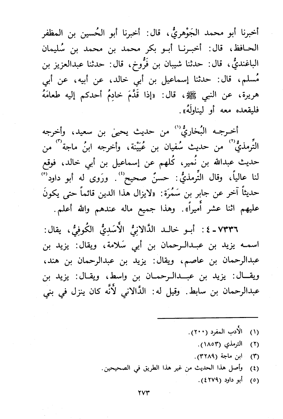 7336 - 4: أَبُو خالد الدالاني الأسدي الكوفي، يقال: اسمه يزيد بن عبد الرحمن بن أَبي سلامة، ويُقال: يزيد بْن عَبْد الرحمن بْن عاصم، ويُقال: يزيد بن عبد الرحمن بن هند، ويُقال: يزيد بْن عَبْد الرحمن بْن واسط، ويُقال: يزيد بْن عَبْد الرَّحْمَن بْن سابط.