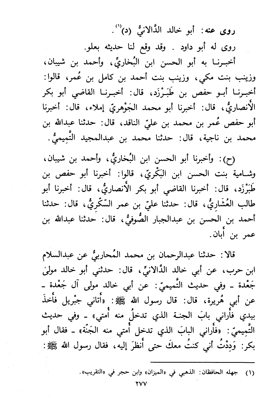 قَالا: حَدَّثَنَا عَبْد الرَّحْمَنِ بْن مُحَمَّد المحاربي عن عبد السلام ابن حَرْبٍ، عَن أَبِي خَالِدٍ الدَّالانِيِّ، قال: حَدَّثَنِي أَبُو خَالِدٍ مَوْلَى جَعْدَةَ - وفِي حَدِيثِ التَّمِيمِيِّ: عَن أَبِي خَالِدٍ مَوْلَى آلِ جَعْدَةَ - عَن أَبِي هُرَيْرة، قال: قال رَسُول اللَّهِ صلى الله عليه وسَلَّمَ: أَتَانِي جِبْرِيلُ فَأَخَذَ بِيَدِي فَأَرَانِي بَابَ الْجَنَّةِ الَّذِي تَدْخُلُ مِنْهُ أُمَّتِي" - وفِي حَدِيثِ التَّمِيمِيِّ: فأراني الباب الذي تدخل أمتي منه الْجَنَّةَ" - فَقَالَ أَبُو بَكْرٍ: ودِدْتُ أَنِّي كُنْتُ مَعَكَ حَتَّى أَنْظُرَ إِلَيْهِ، فَقَالَ رَسُولُ اللَّهِ صَلَّى الله عليه وسلم: